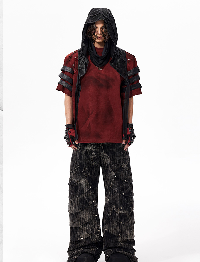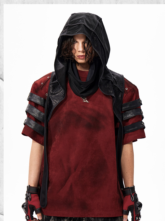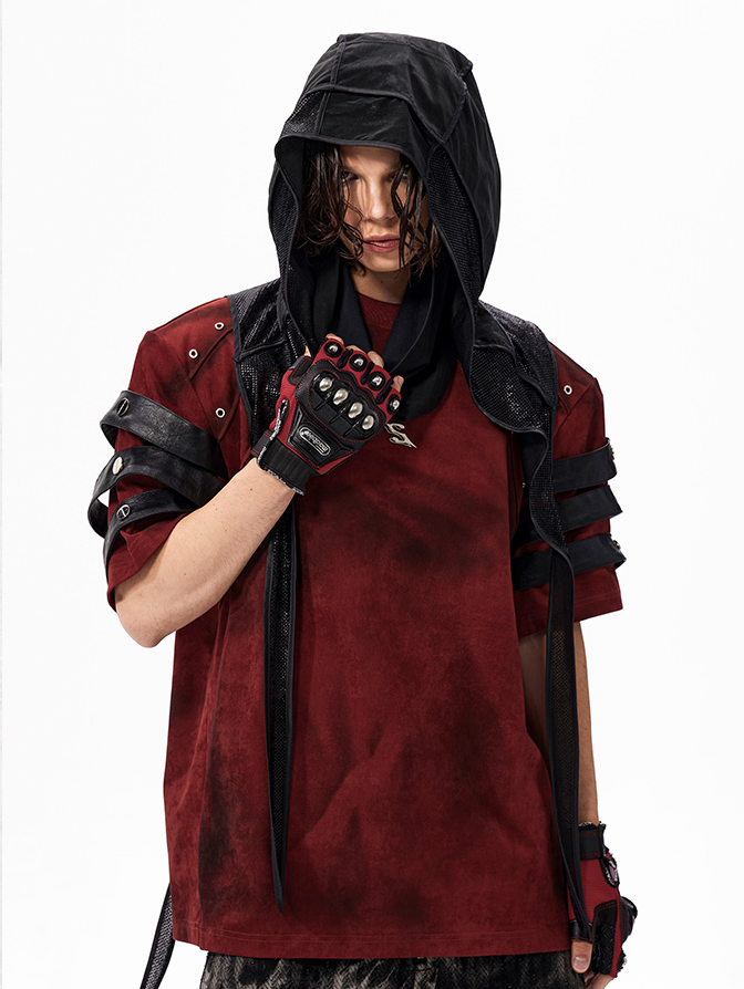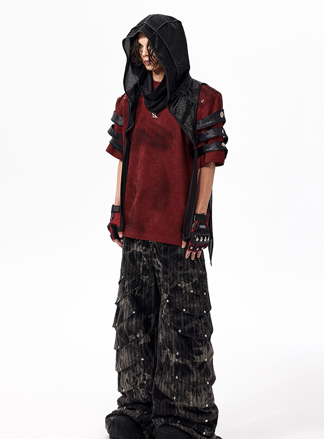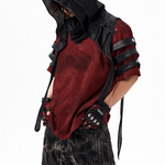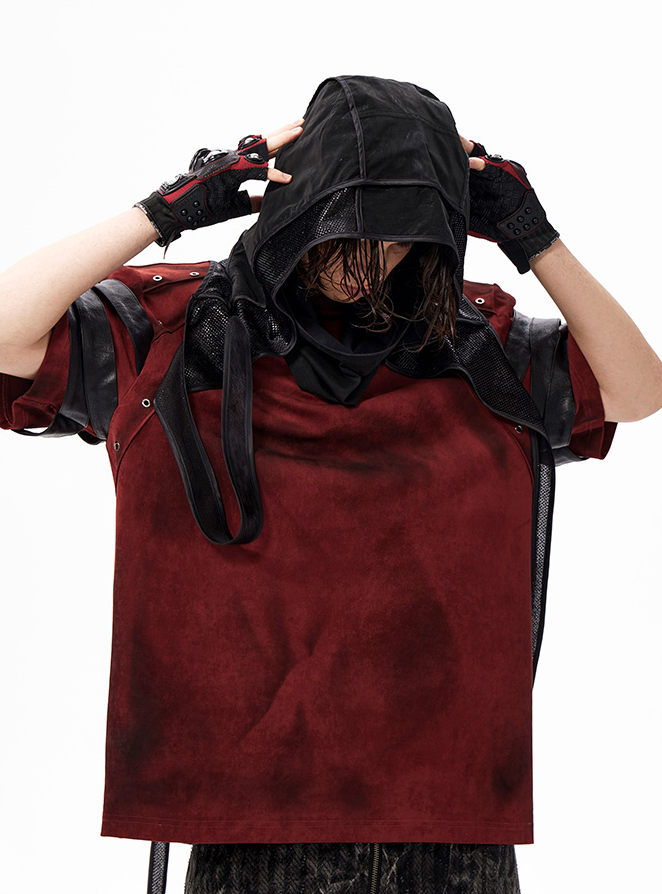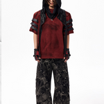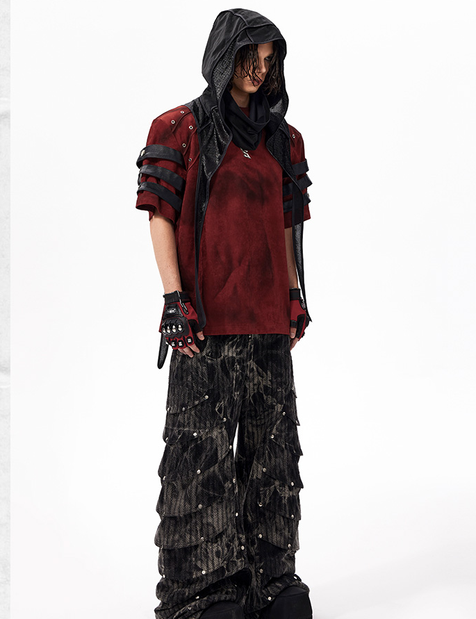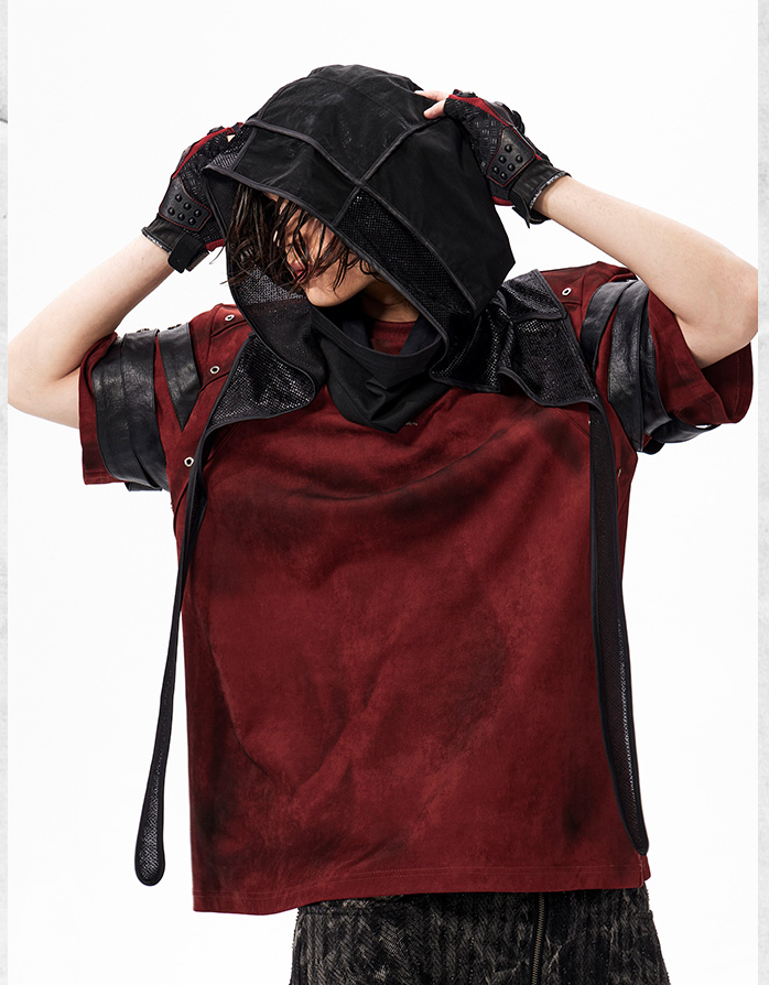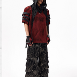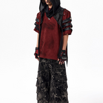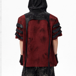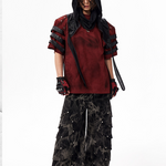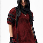 The Warcore Tactical Shirt embodies military aesthetics through its characteristic layering details and metal rivets. This distinctive top in deep burgundy red combines functional elements with rebellious design and creates a unique balance between tactical performance and street fashion. The layered sleeves with black contrast strips and the strategically placed metal eyelets redefine modern warcore aesthetics.