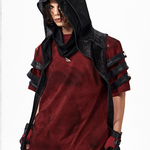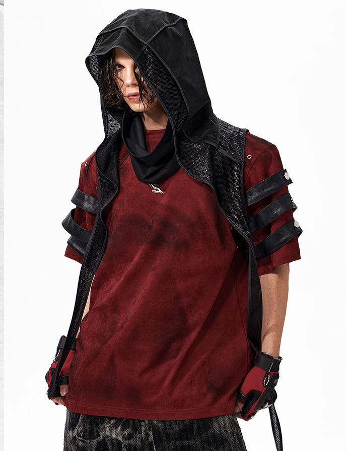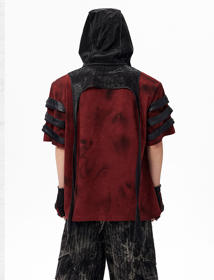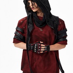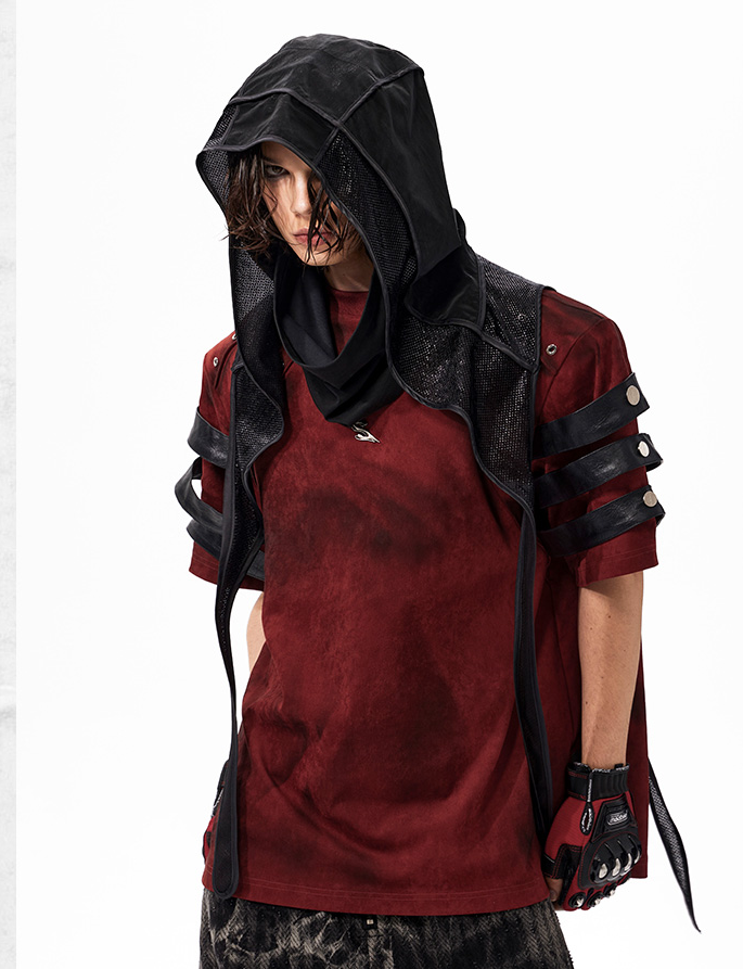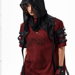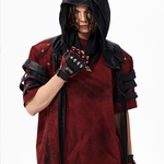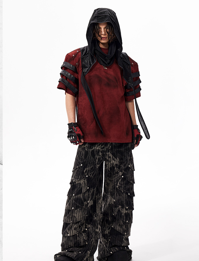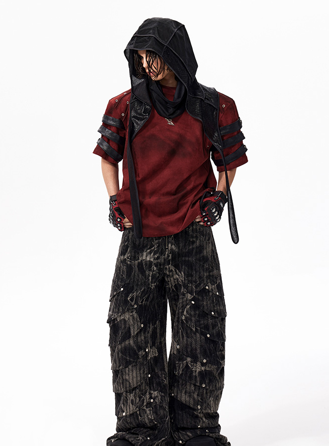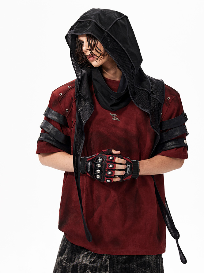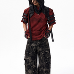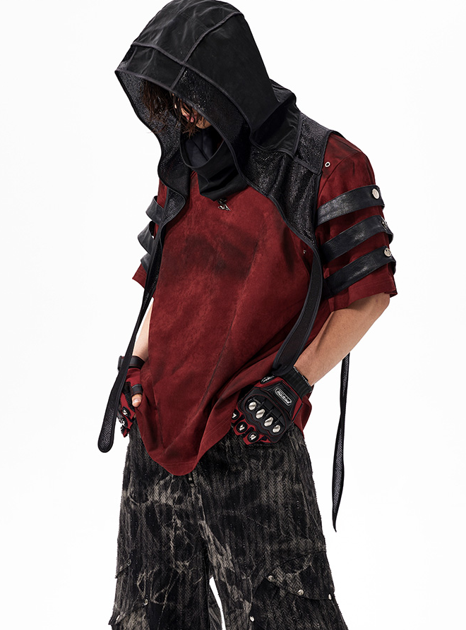 The Warcore Tactical Shirt embodies military aesthetics through its characteristic layering details and metal rivets. This distinctive top in deep burgundy red combines functional elements with rebellious design and creates a unique balance between tactical performance and street fashion. The layered sleeves with black contrast strips and the strategically placed metal eyelets redefine modern warcore aesthetics.