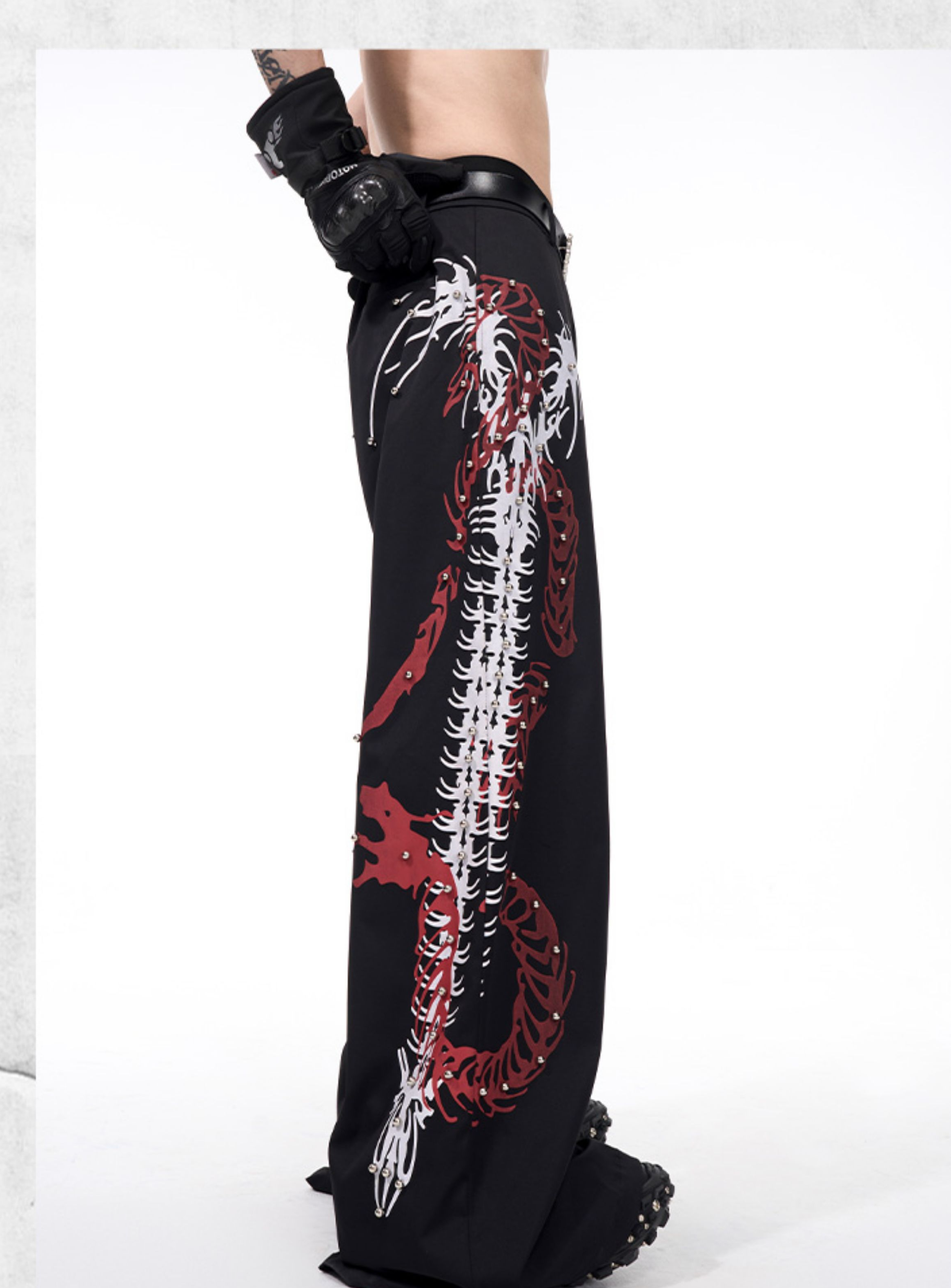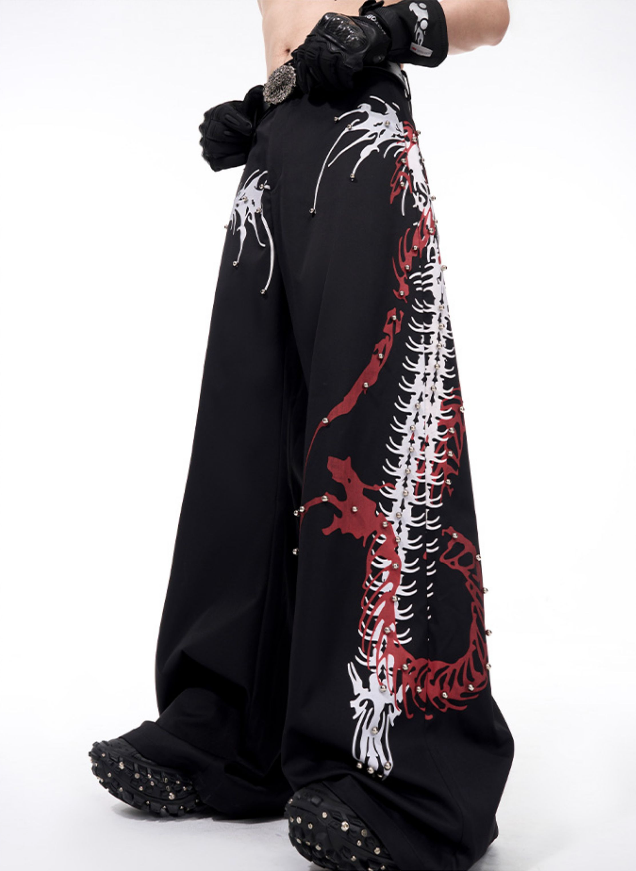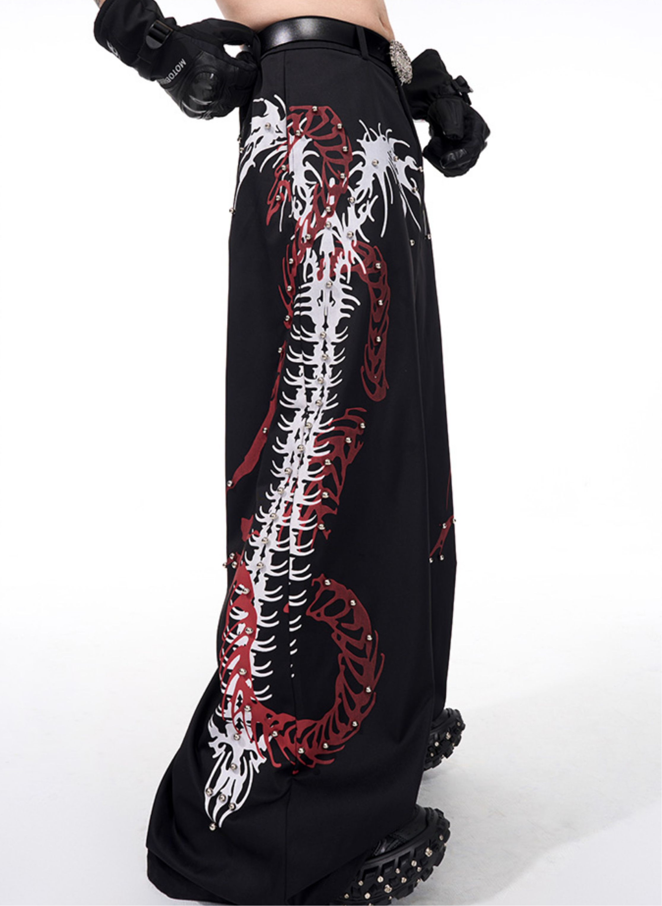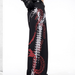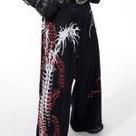 Define our Dragon Spine Pants Y2K-Streetwear new through their dramatic graphics and oversized silhouette. The characteristic dragon and spine motif extends over the entire leg length and creates dynamic, mythological aesthetics. The precise details with red blood splashes and white bone elements embody the rebellious spirit of the Y2K Fashion And make these pants a real collector's item.