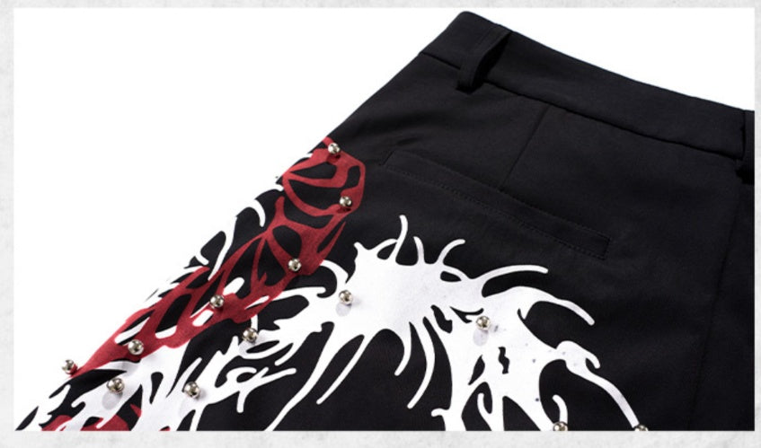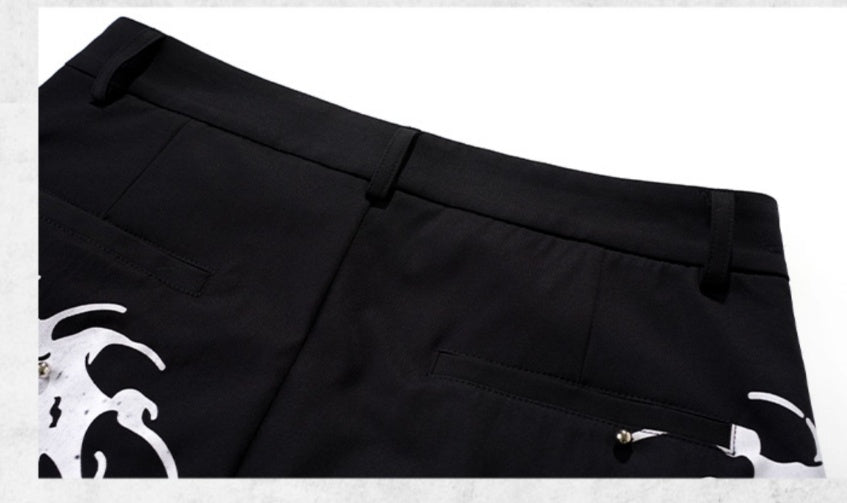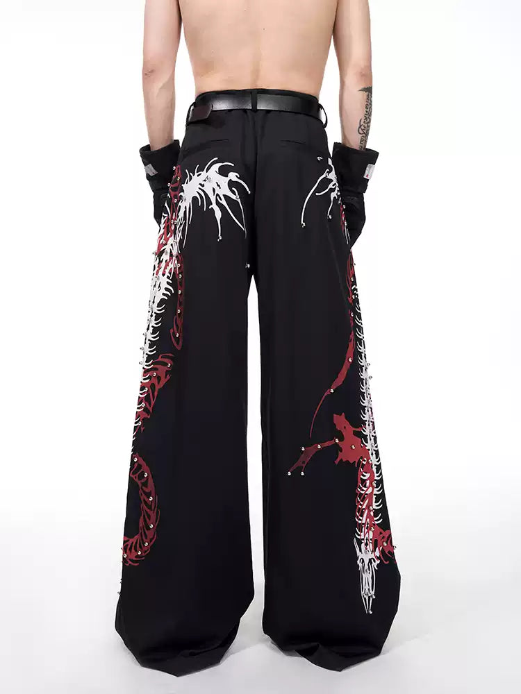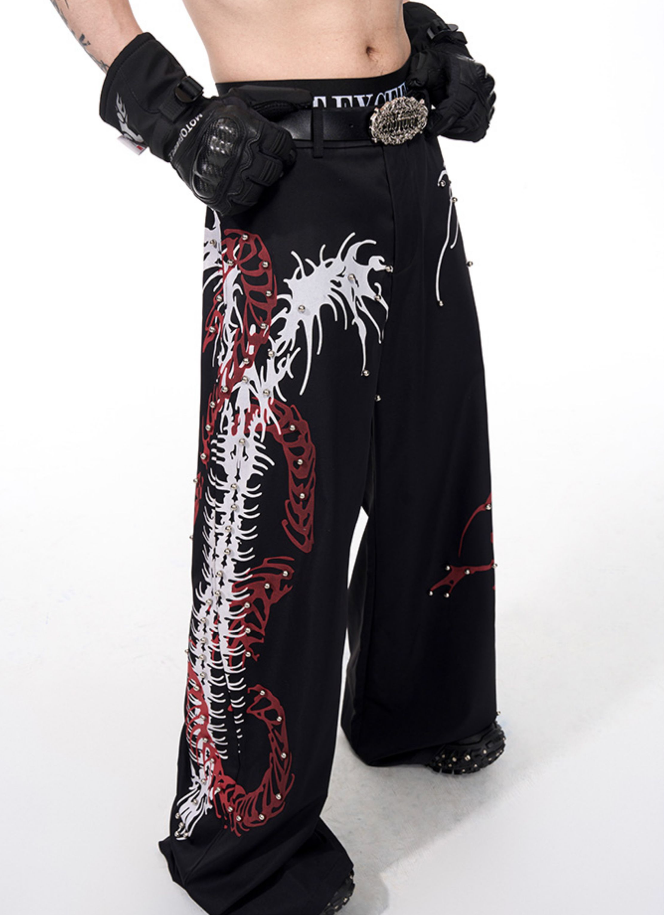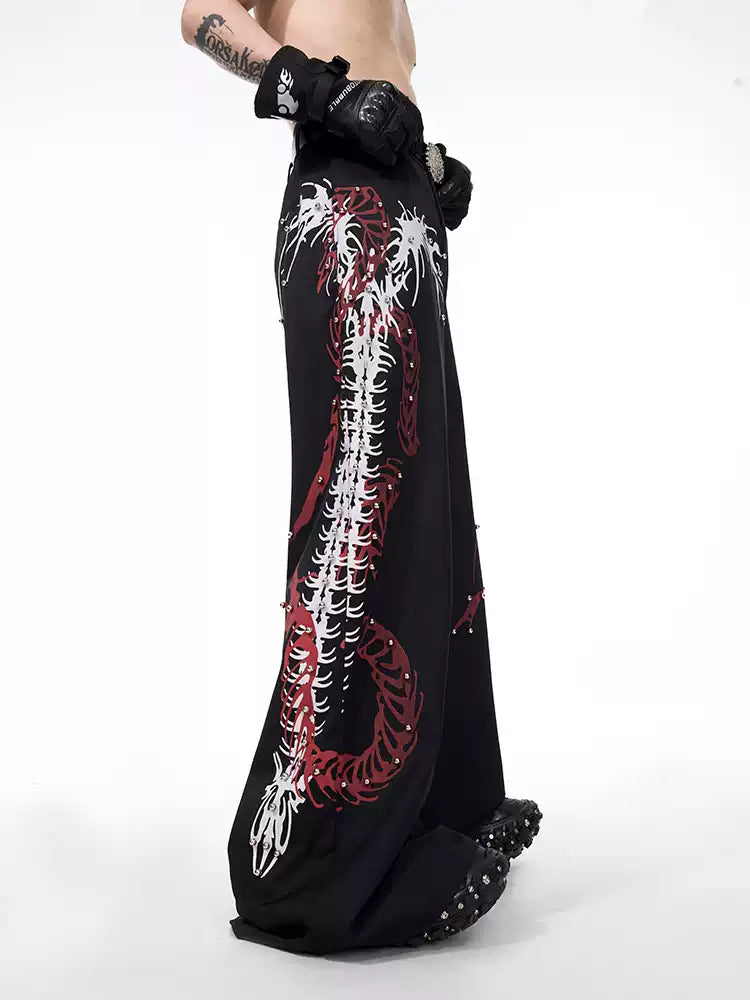 Define our Dragon Spine Pants Y2K-Streetwear new through their dramatic graphics and oversized silhouette. The characteristic dragon and spine motif extends over the entire leg length and creates dynamic, mythological aesthetics. The precise details with red blood splashes and white bone elements embody the rebellious spirit of the Y2K Fashion And make these pants a real collector's item.