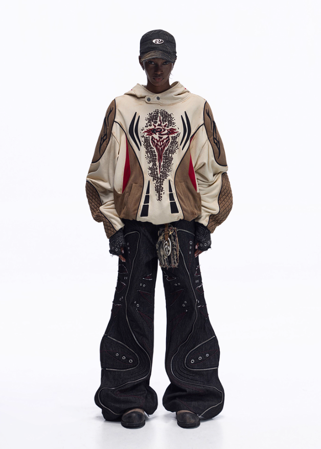 Hinweis: Die oversized Hoodie-Silhouette ist bewusst im zeitgenössischen Opium-Stil geschnitten und sollte locker getragen werden. Die Multi-Panel-Konstruktion kann leichte Variationen in der Farbintensität aufweisen, die den handgefertigten Charakter unterstreichen. Der Druckknopf-Kragenverschluss ermöglicht vielseitige Styling-Optionen. Bitte beachte die Größentabelle für die optimale Passform.