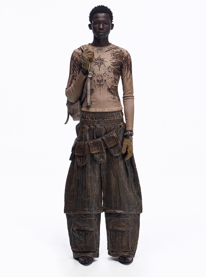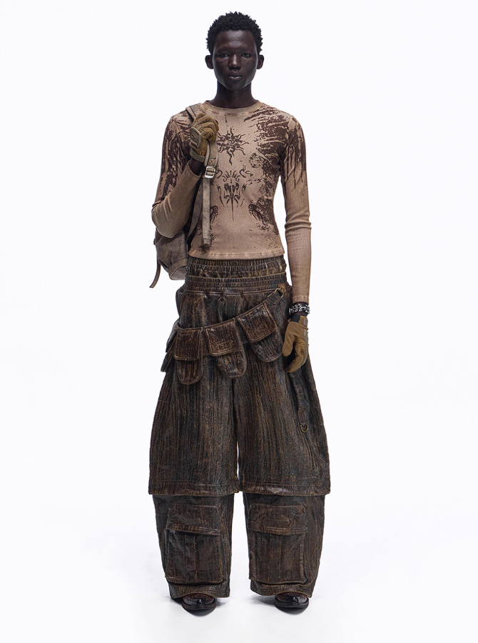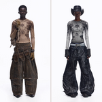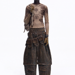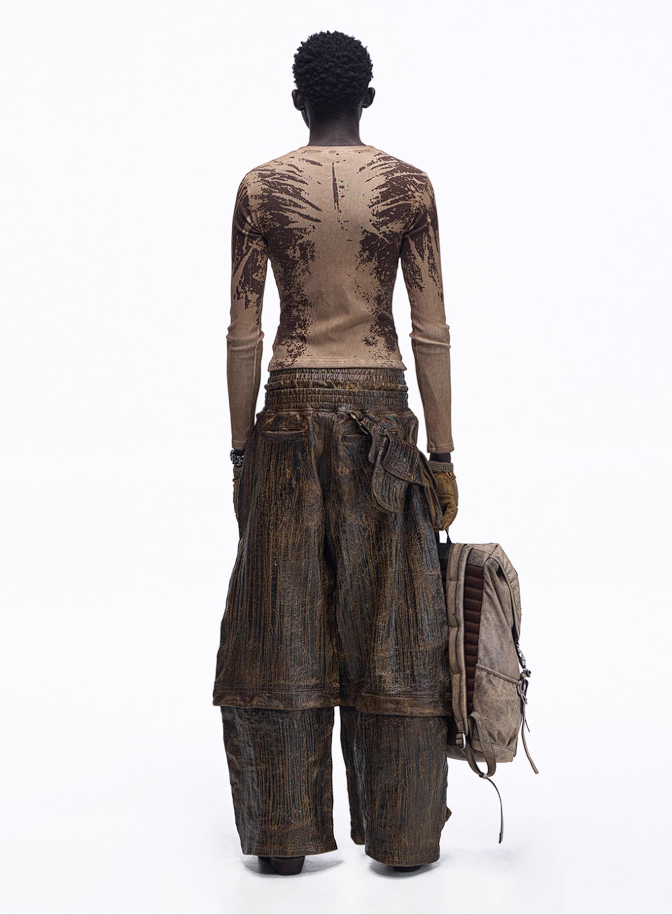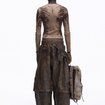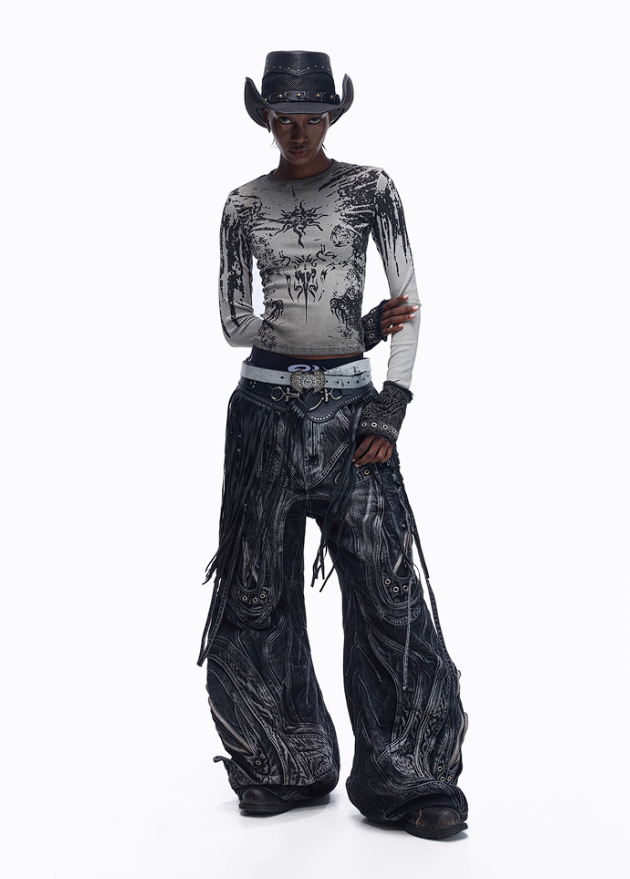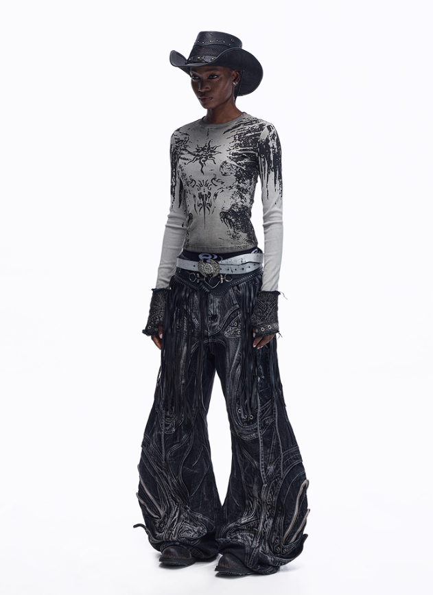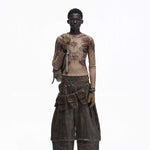 Hinweis: Die body-hugging Passform ist bewusst figurbetont geschnitten. Der vintage Distressed-Effekt und die Grunge-Texturen können leichte Variationen aufweisen, die den handgefertigten Charakter unterstreichen. Die cropped Länge ist Teil des Designs. Bitte beachte die Größentabelle für die optimale Passform.