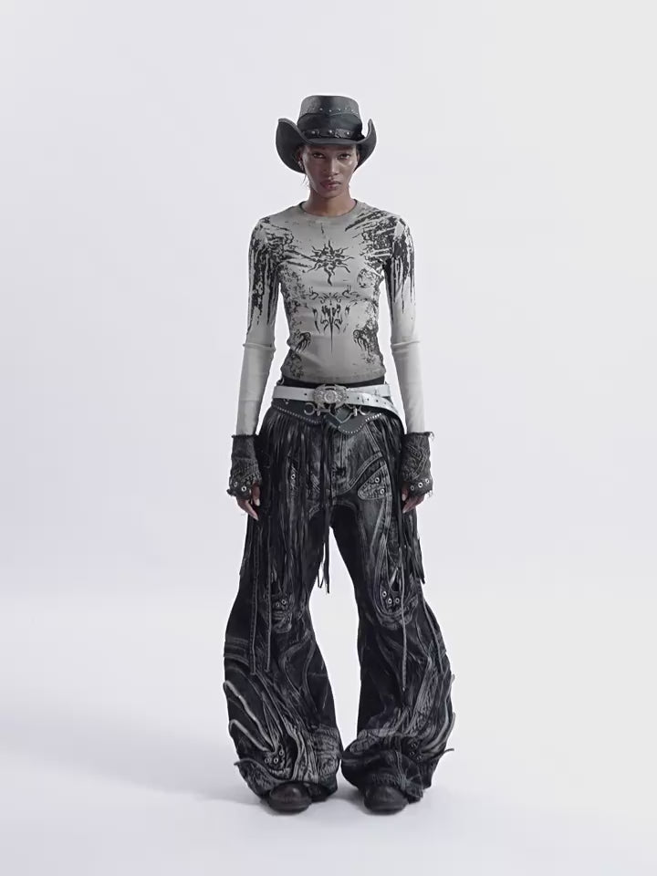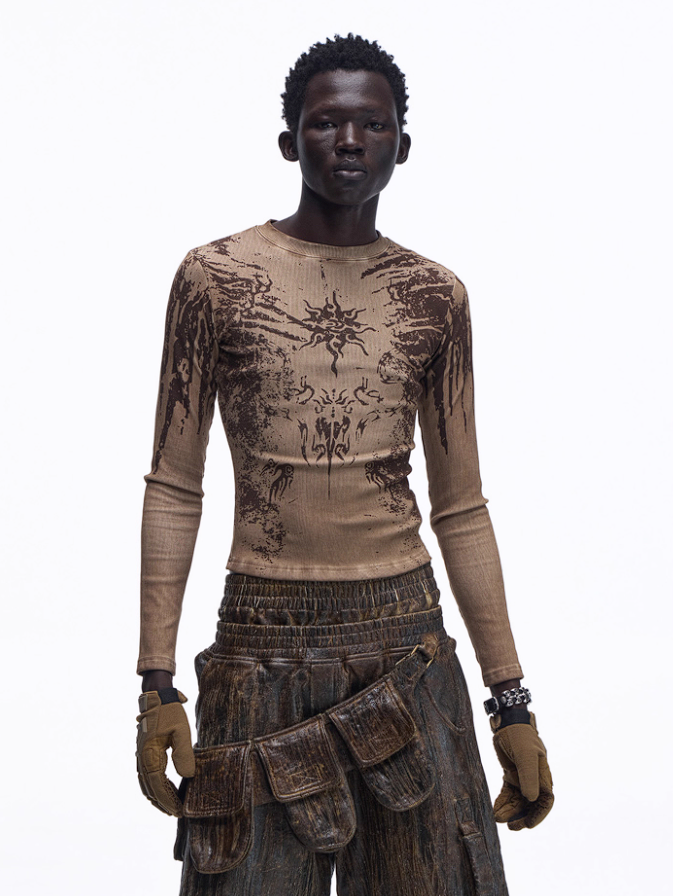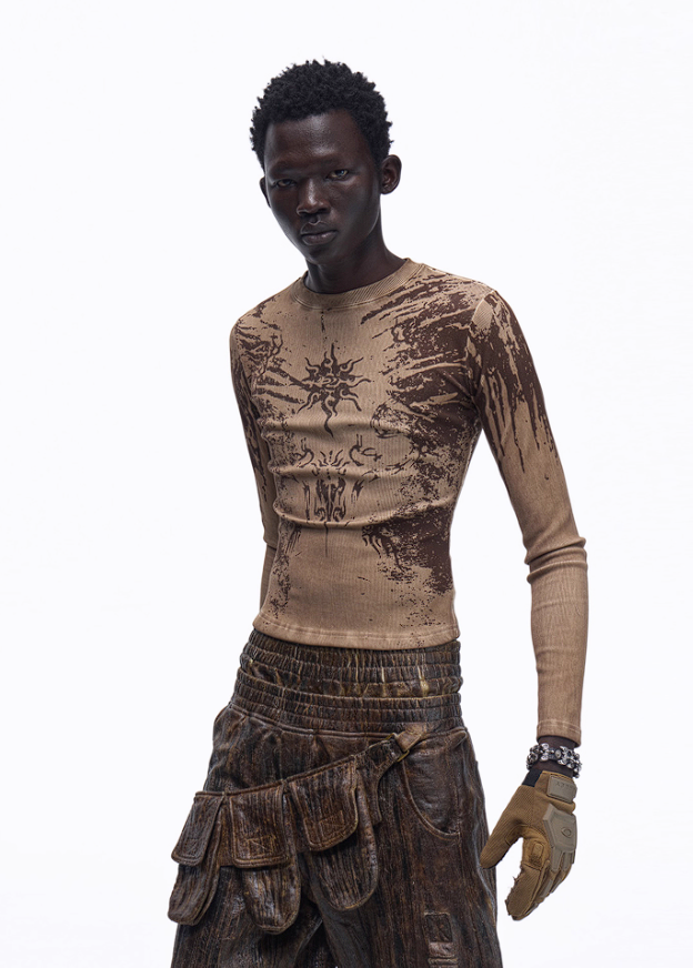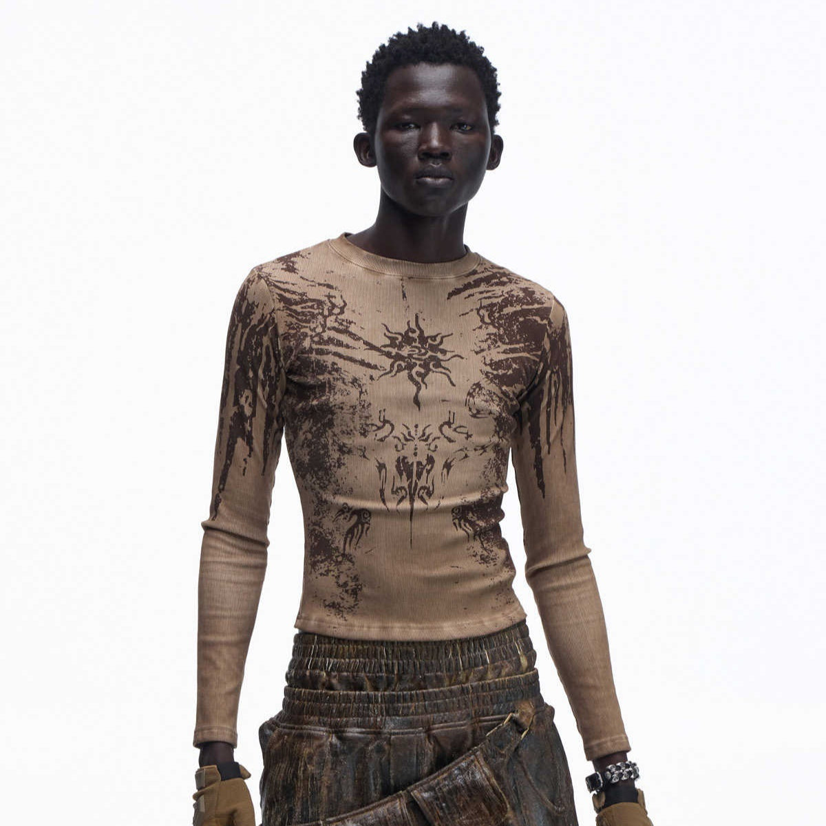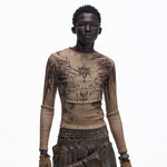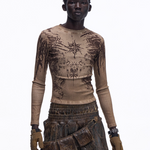 Unser Grunge Print Longsleeve Top definiert luxuriöse Opium Fashion durch sein aufwendiges All-Over-Print-Design mit mystischen Symbolen neu. Das spektakuläre Artwork zeigt zentrale Sonnen-Motive, tribal-inspirierte Elemente und organische Grunge-Texturen, die über den gesamten Körper und die Ärmel verlaufen. Der vintage Distressed-Effekt schafft einen authentischen worn-in Look. Die Premium-Baumwoll-Rippstrick-Konstruktion bietet optimale Elastizität und body-hugging Passform. Der klassische Rundhalsausschnitt mit gerippten Bündchen an Ärmeln und Saum sorgt für perfekten Sitz. Entdecke unsere komplette Opium Fashion Kollektion für weitere dark aesthetic Pieces.
