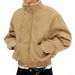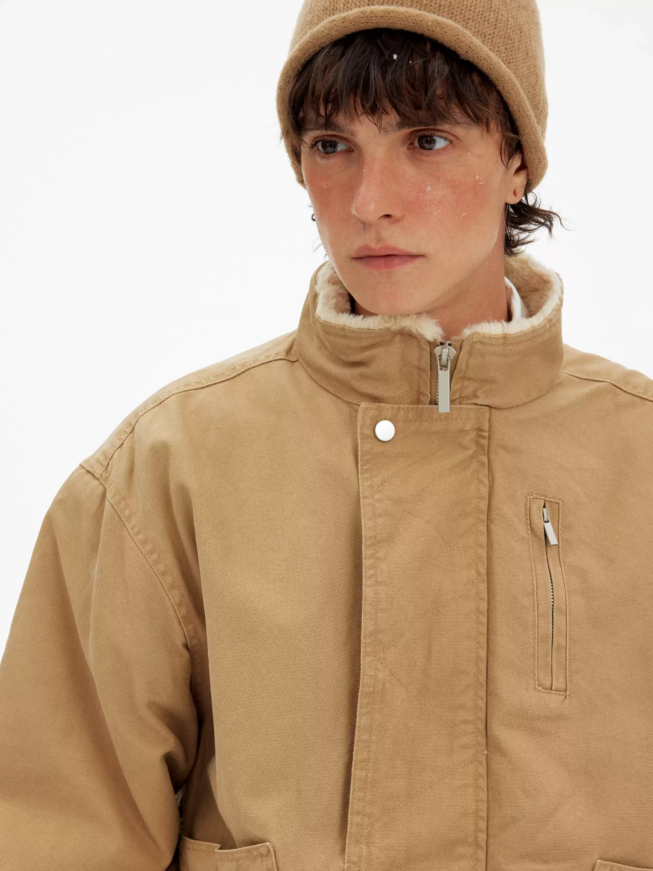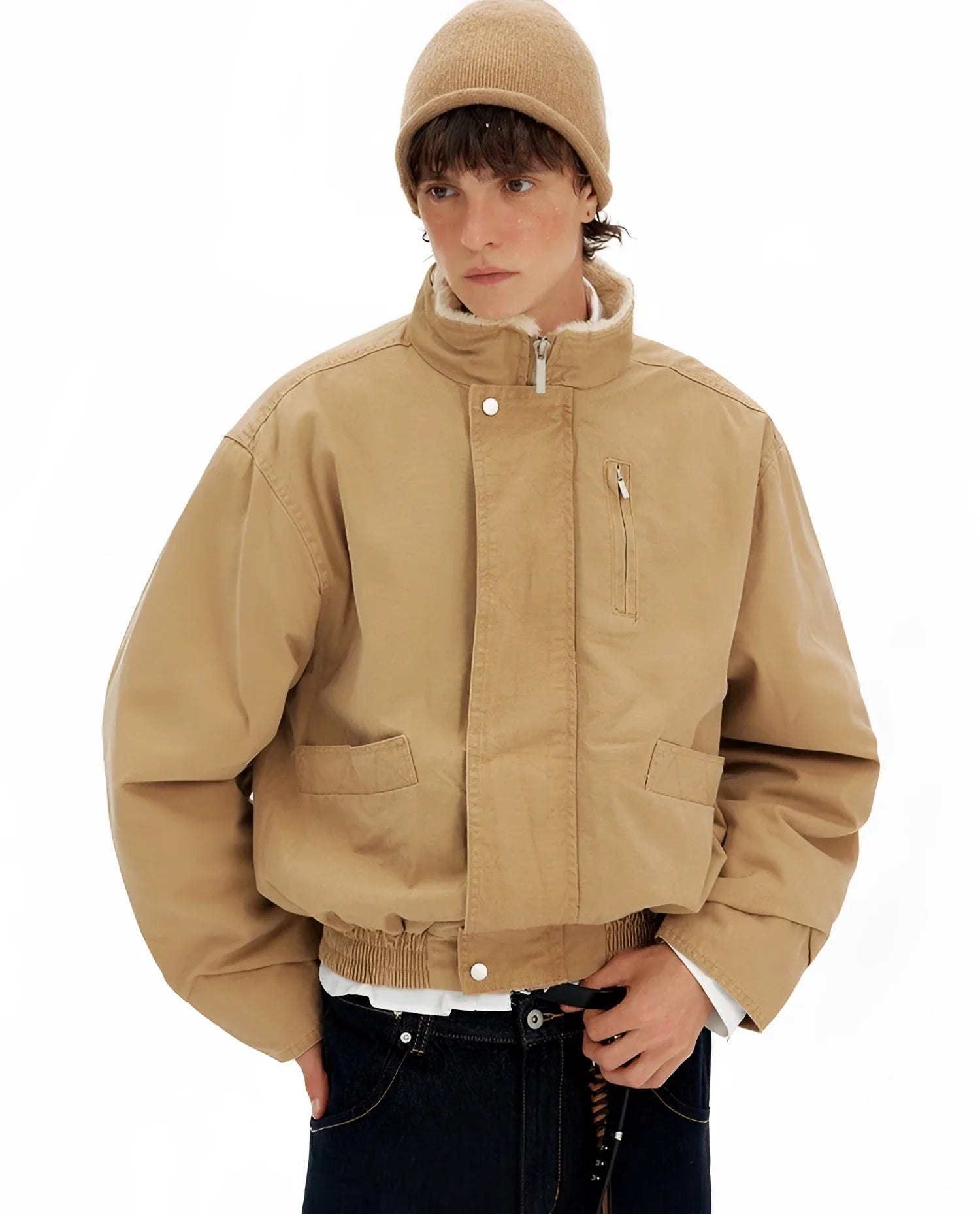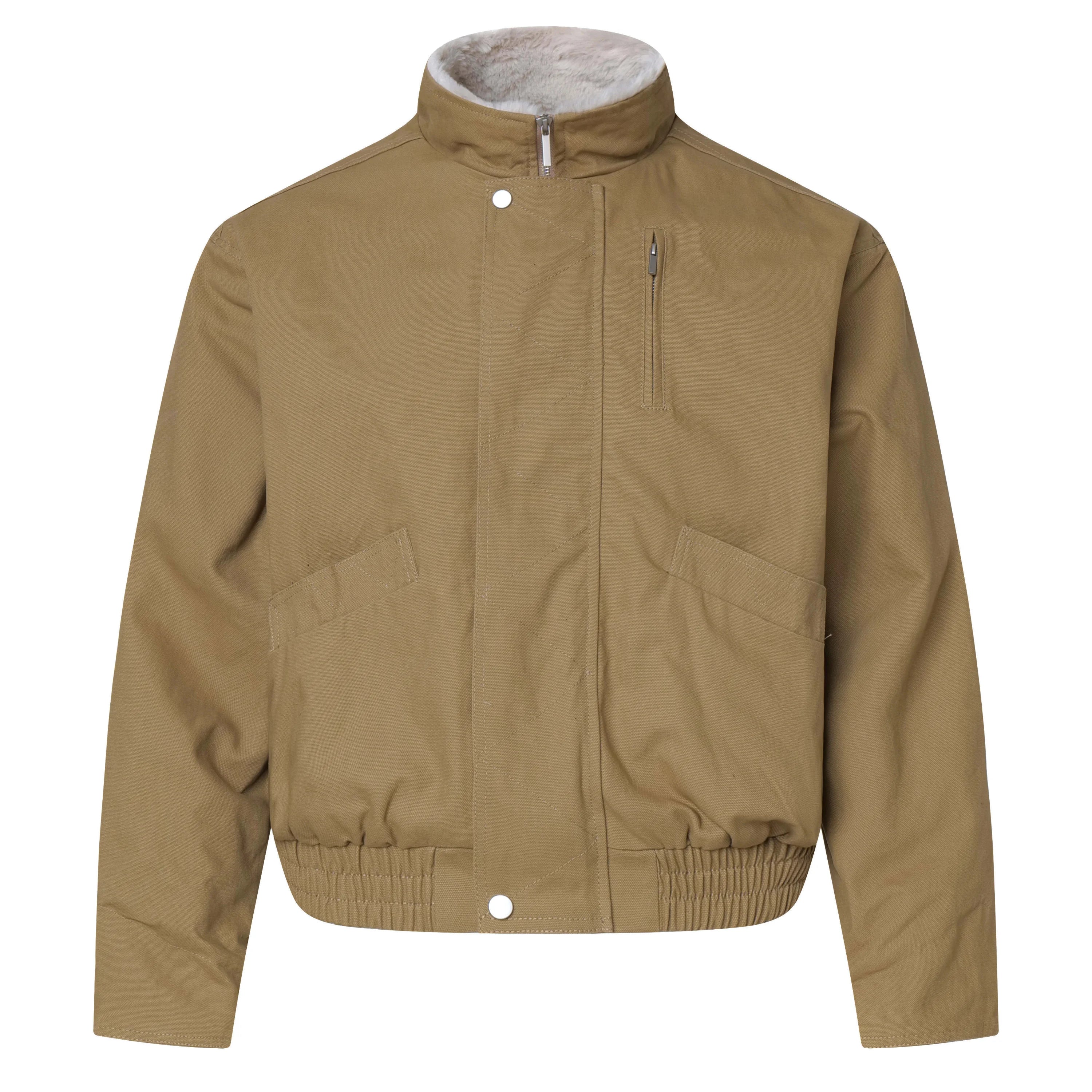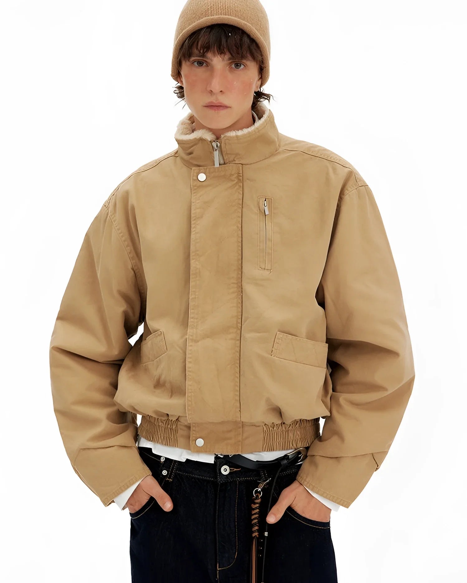 Businesscore シェルパ カラー ボンバー ジャケットは、クラシックなワークウェアの美学と現代的な快適さを組み合わせたものです。コットン 100% で作られたこのクロップド ボンバー ジャケットは、視覚的なハイライトであると同時に暖かさの機能的要素でもある豪華なシェルパ襟が印象的です。時代を超越したキャメルのカラーと丈夫なキャンバス構造により、過渡期以降に多用途に使える必需品です。