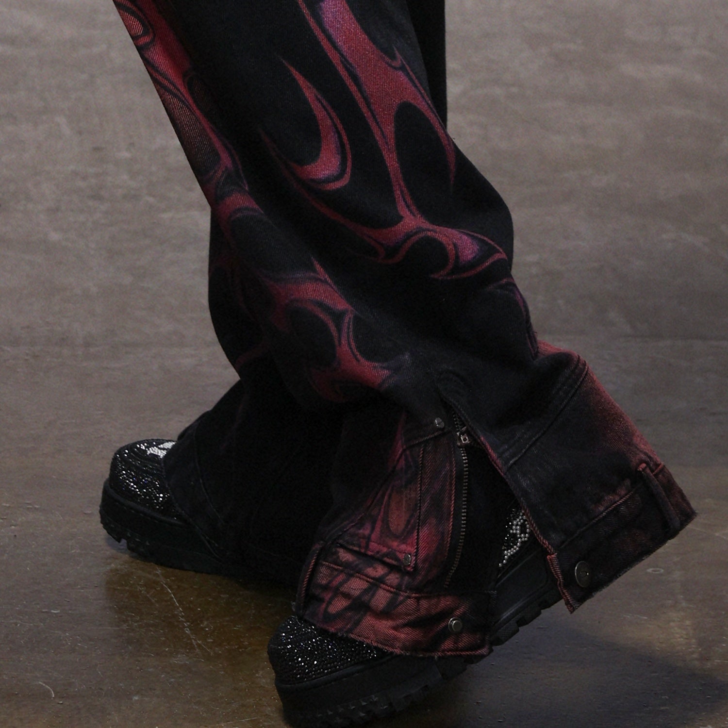 불꽃 프린트 와이드 레그 진이 정의합니다. Y2K 화려한 대칭 불꽃 디자인으로 패션을 연출합니다. 부족에서 영감을 받은 불꽃 패턴은 양쪽 다리를 따라 유기적으로 이어져 포화 색상에서 검정색까지 매혹적인 그라데이션 효과를 만들어냅니다. 밑단에 지퍼 디테일이 있는 매우 넓은 다리 개구부로 다양한 스타일링 옵션이 가능합니다. 고품질 면-폴리에스테르 원단은 최대의 표현 효과와 함께 최적의 편안함을 제공합니다. 우리의 완전한 것을 발견하십시오 Y2K 패션 컬렉션 더 많은 2000년대 영감을 받은 작품을 만나보세요.