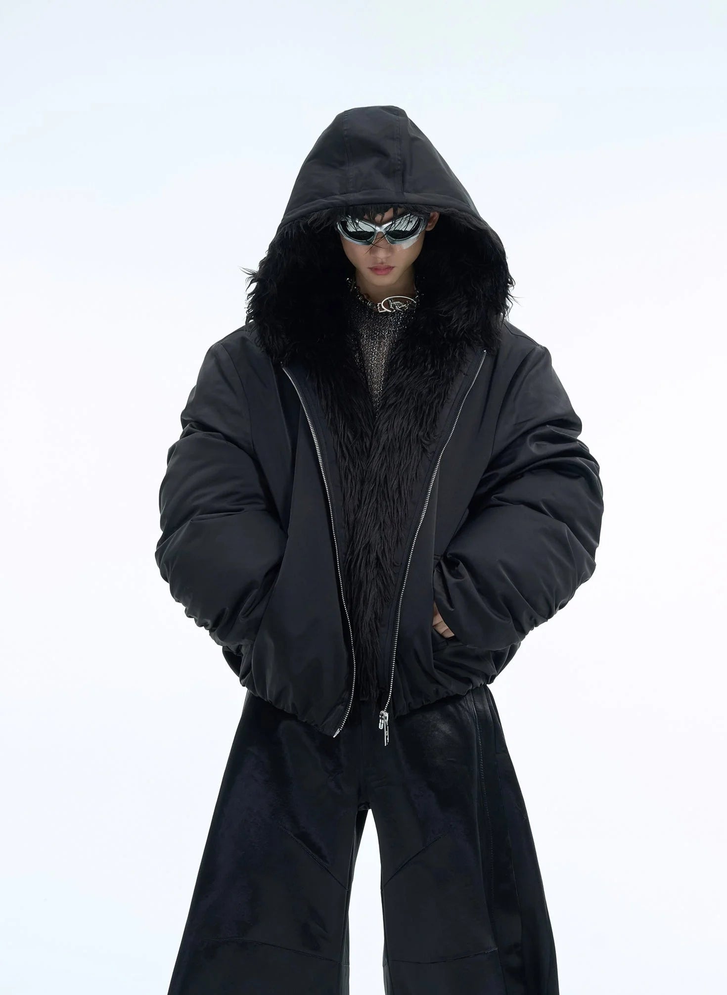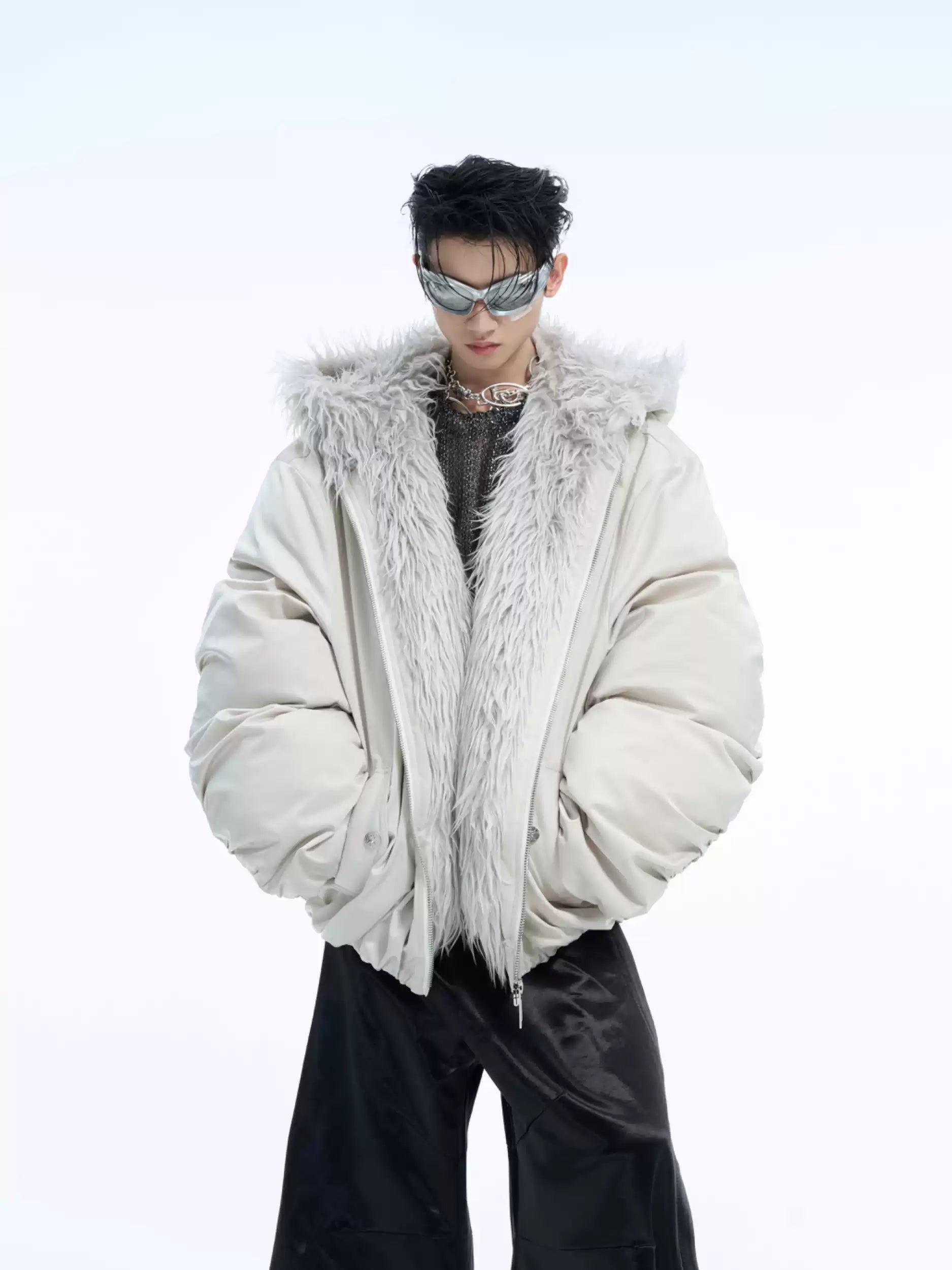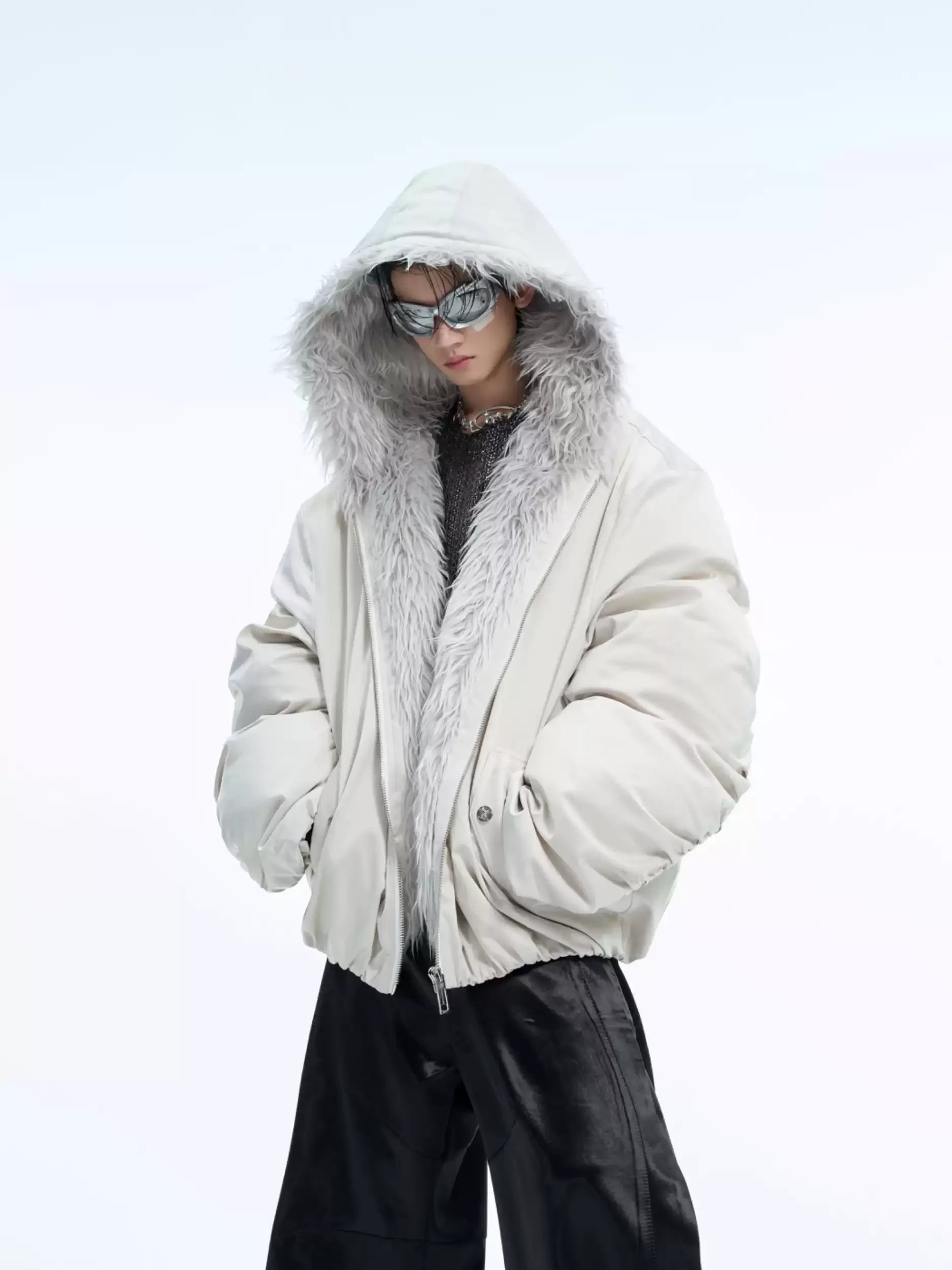 Unsere Faux Fur Puffer Jacket repräsentiert die Evolution luxuriöser Streetwear durch ihre spektakuläre Kombination aus voluminöser Silhouette und edlen Kunstfell-Akzenten. Der großzügige Faux-Fur-Kragen fungiert als dramatisches Statement-Element, während die Oversized-Passform charakteristisch für die Opium Fashion Philosophie ist. Die hochwertige Puffer-Konstruktion garantiert sowohl Wärme als auch unvergleichlichen Style-Faktor.