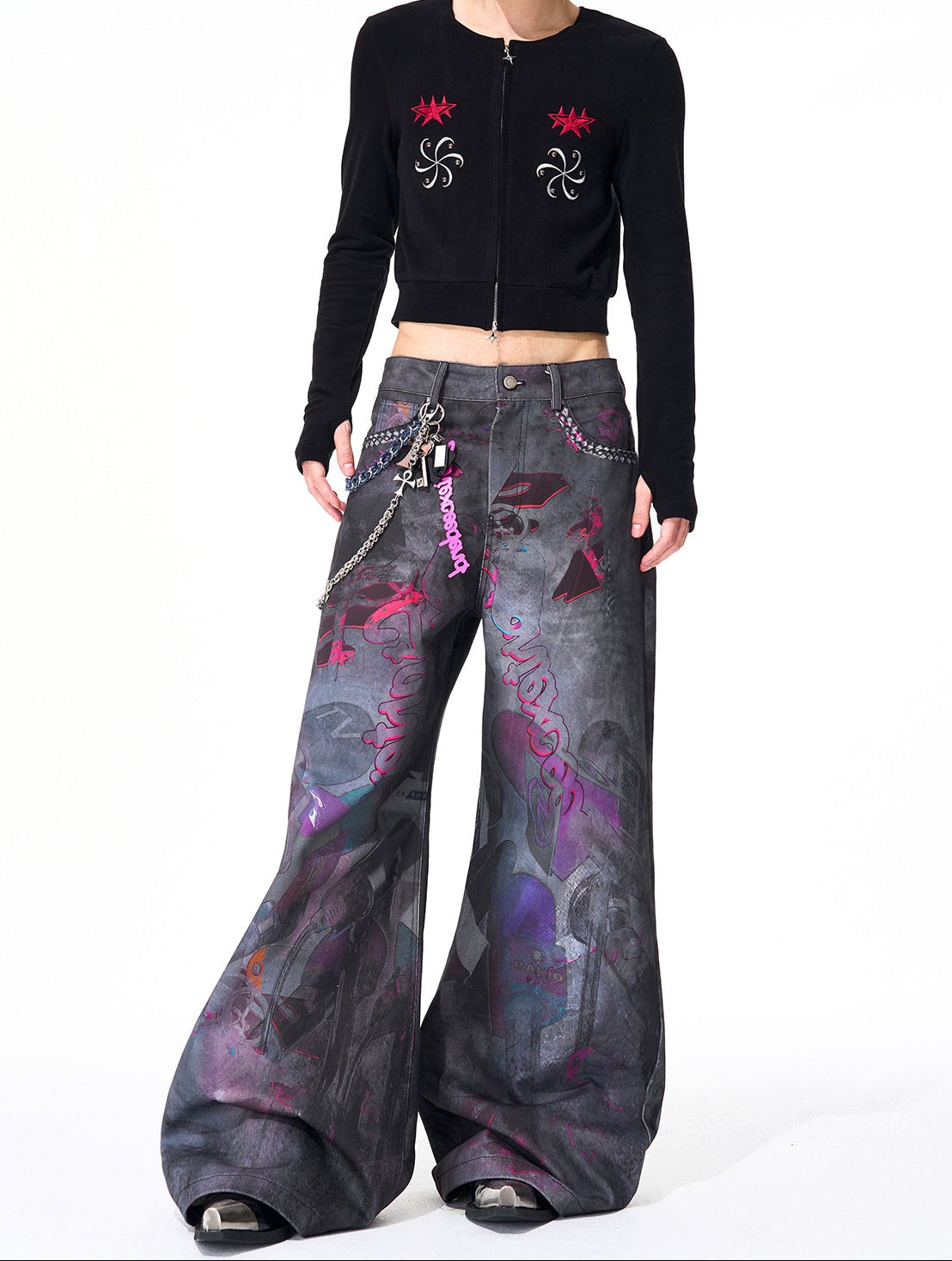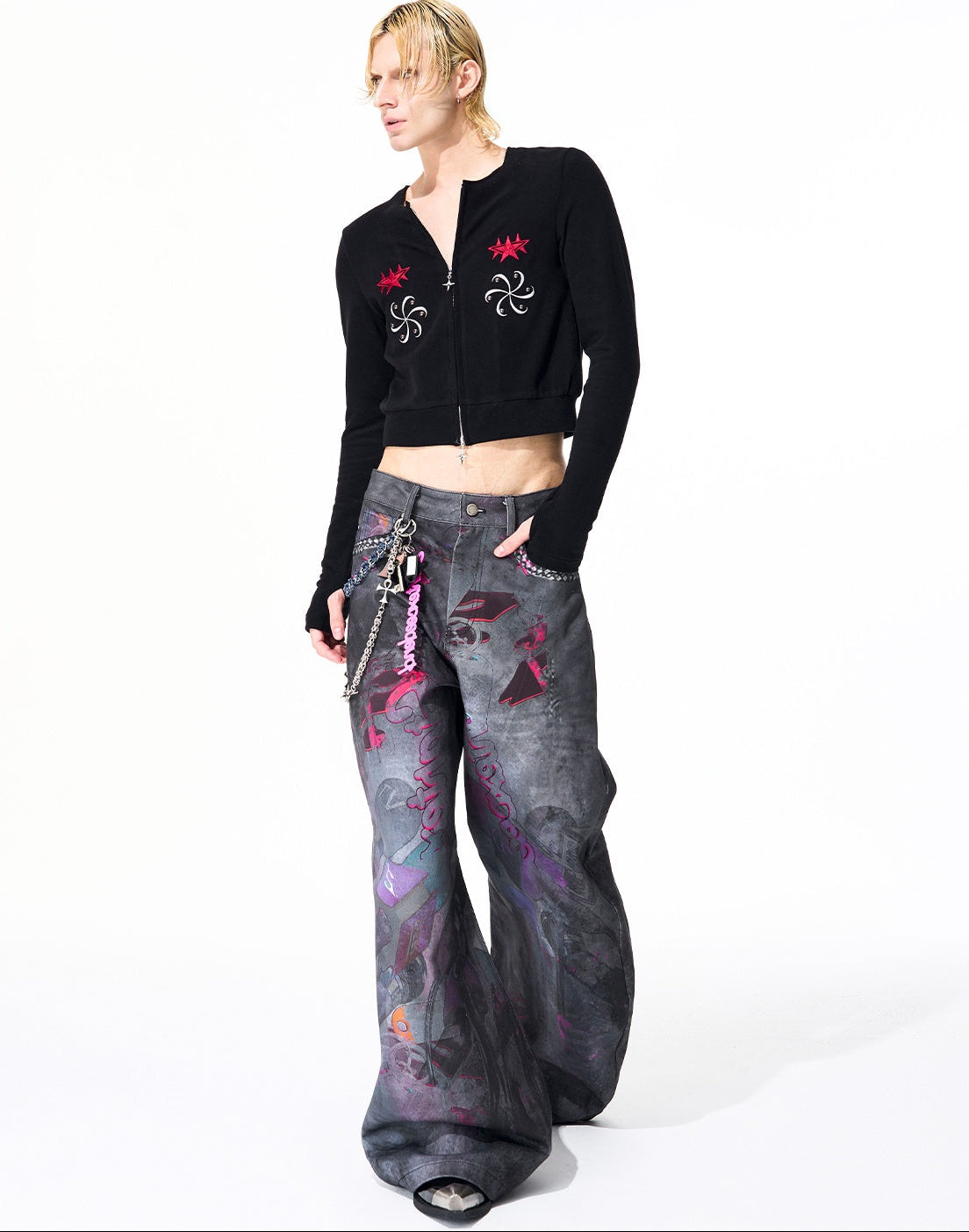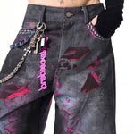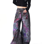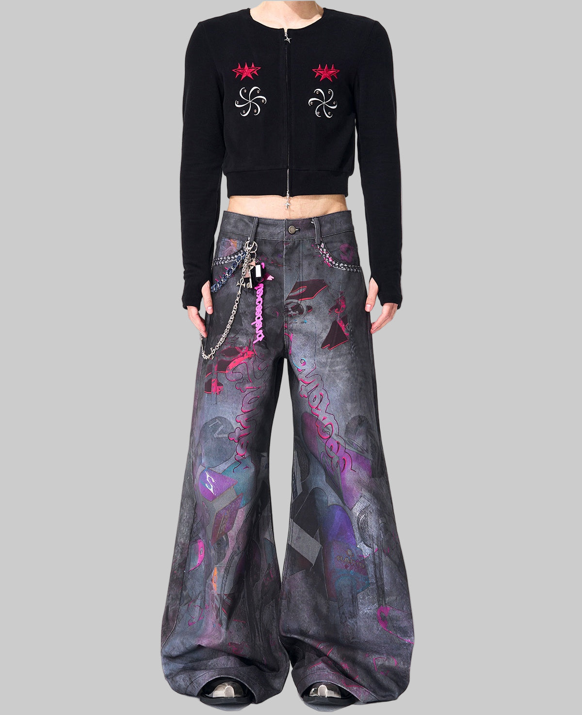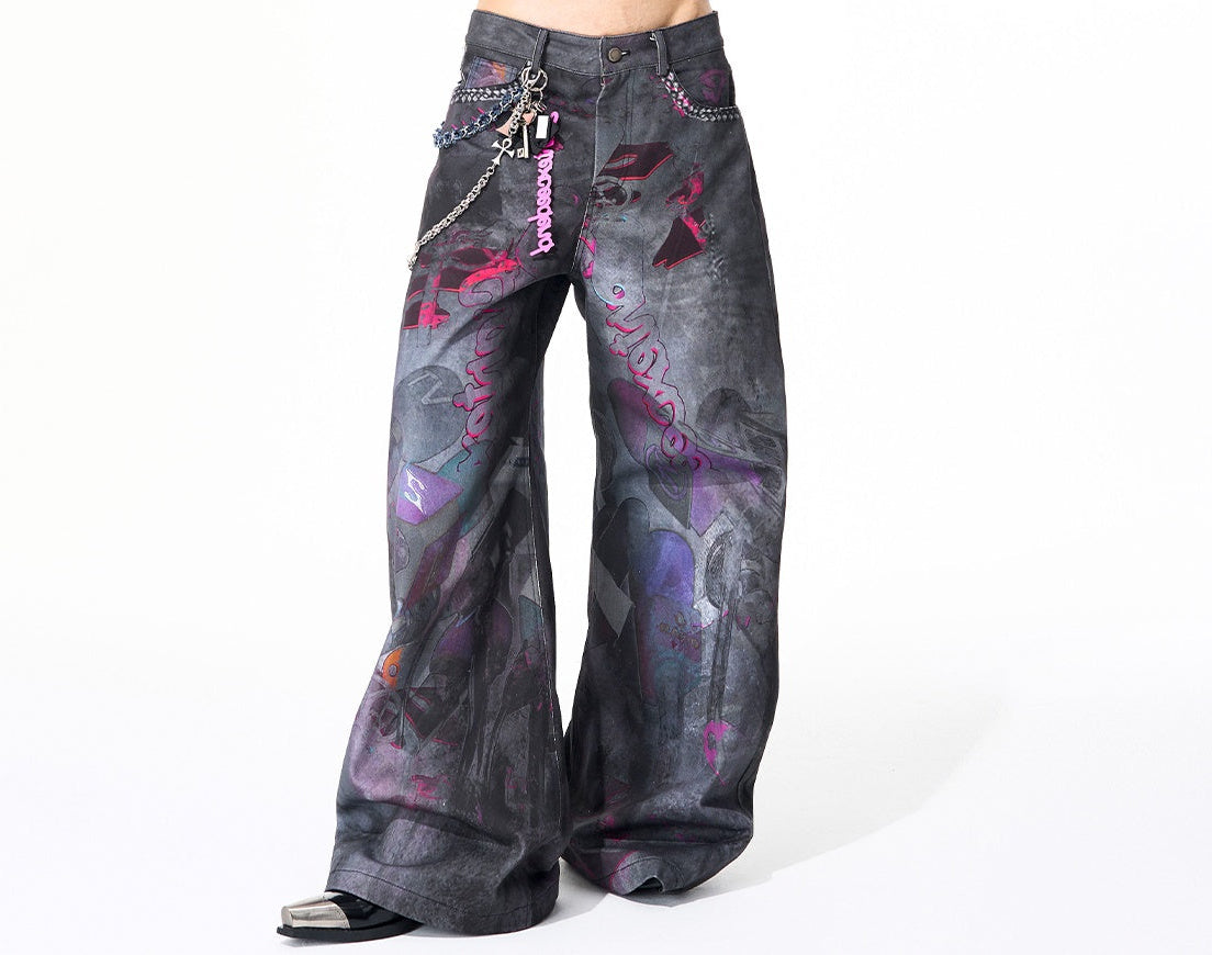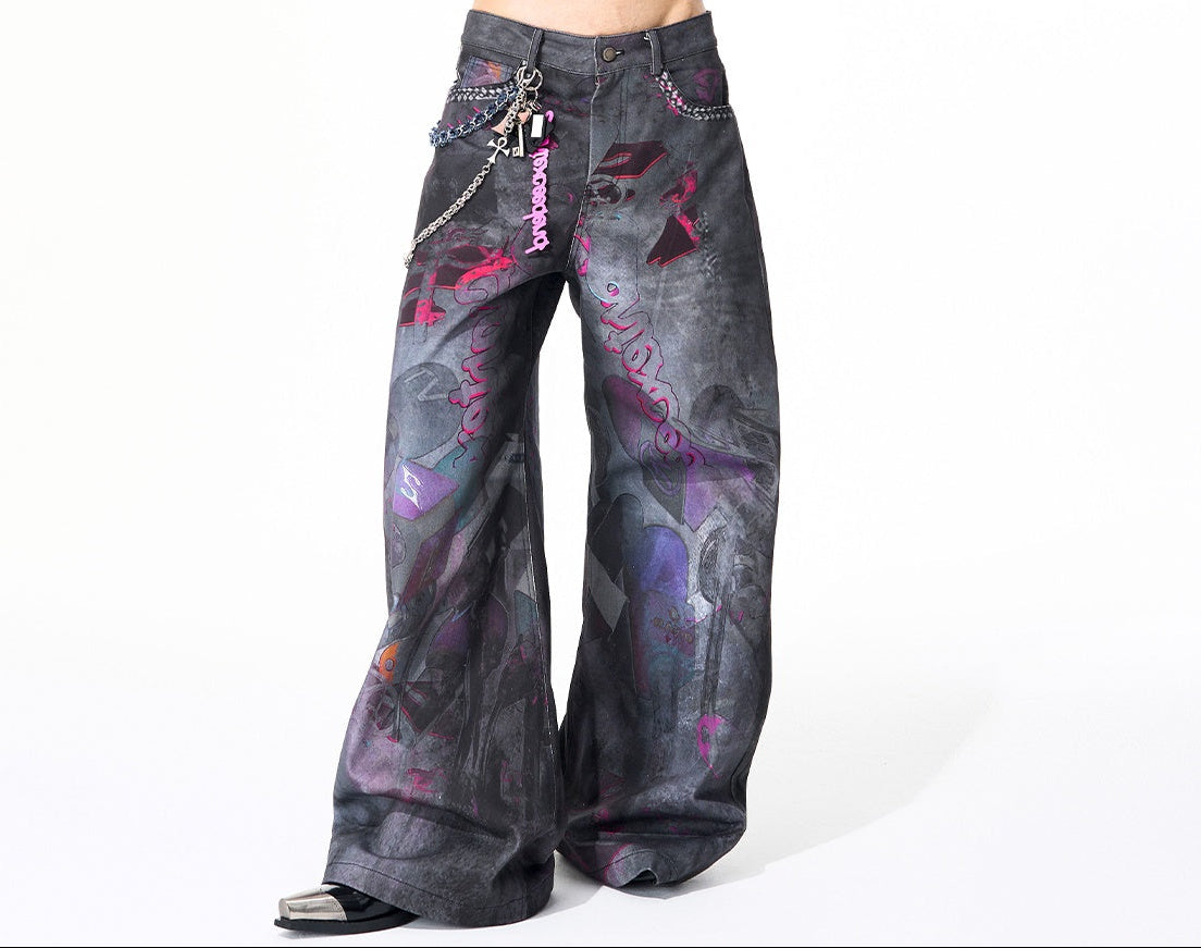 Die Opium Graffiti Art Wide Leg Jeans repräsentiert die Zukunft dystopischer Streetwear durch ihre einzigartige Kombination aus 3D-Digital-Print-Technologie und handwerklicher Verarbeitung. Diese avantgardistische Statement-Hose besteht aus 100% Baumwoll-Denim und besticht durch ihre charakteristische Graffiti-Artwork mit abstrakten Symbolen, Schriftzeichen und Farbverläufen in Pink, Lila und Orange. Die integrierten Kettenelemente mit dekorativem Schlüsselanhänger und die breite Flared-Silhouette schaffen eine perfekte Balance zwischen künstlerischem Ausdruck und rebellischer Mode-Identität.