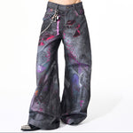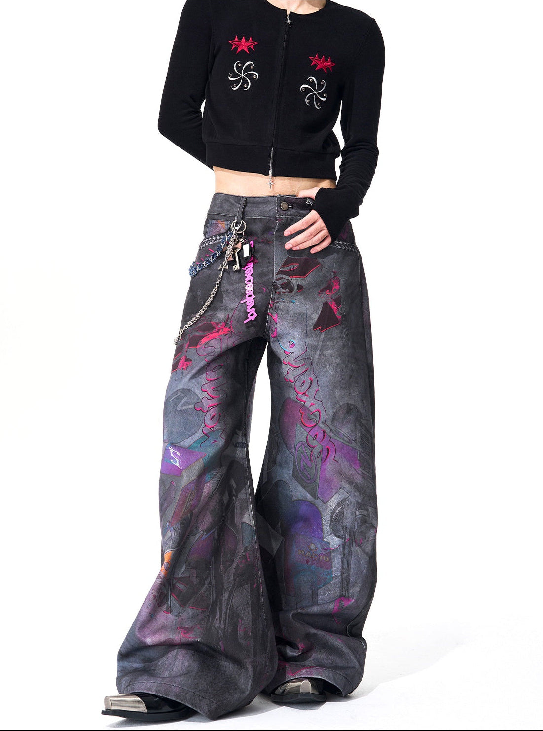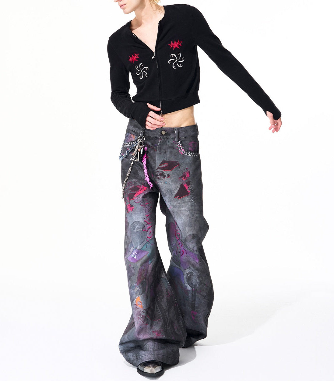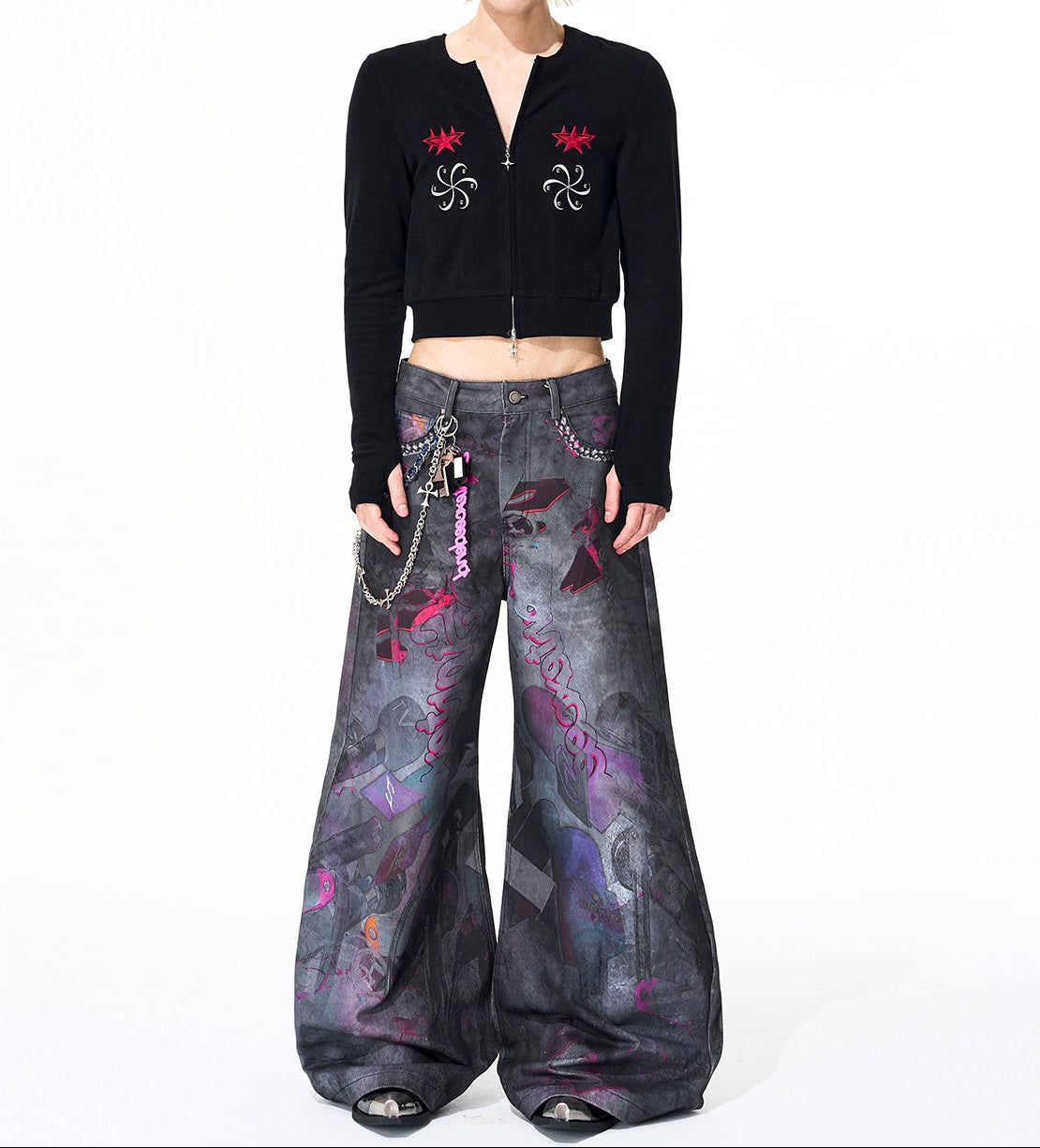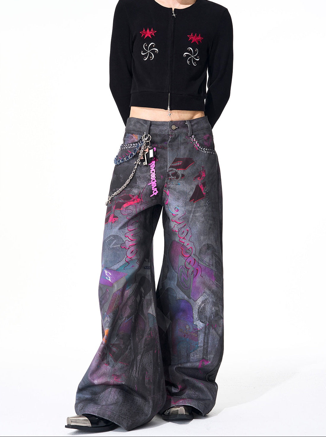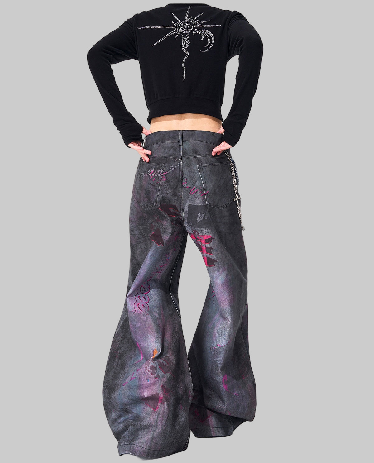 Die Opium Graffiti Art Wide Leg Jeans repräsentiert die Zukunft dystopischer Streetwear durch ihre einzigartige Kombination aus 3D-Digital-Print-Technologie und handwerklicher Verarbeitung. Diese avantgardistische Statement-Hose besteht aus 100% Baumwoll-Denim und besticht durch ihre charakteristische Graffiti-Artwork mit abstrakten Symbolen, Schriftzeichen und Farbverläufen in Pink, Lila und Orange. Die integrierten Kettenelemente mit dekorativem Schlüsselanhänger und die breite Flared-Silhouette schaffen eine perfekte Balance zwischen künstlerischem Ausdruck und rebellischer Mode-Identität.