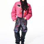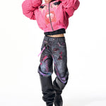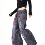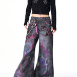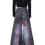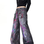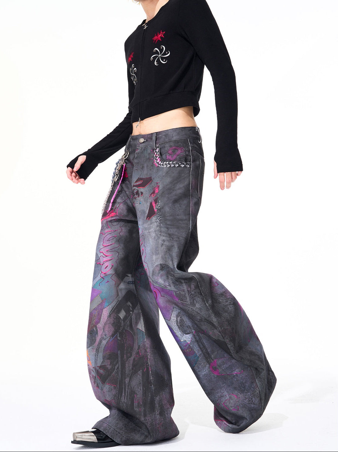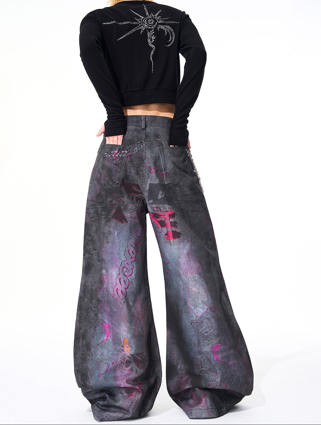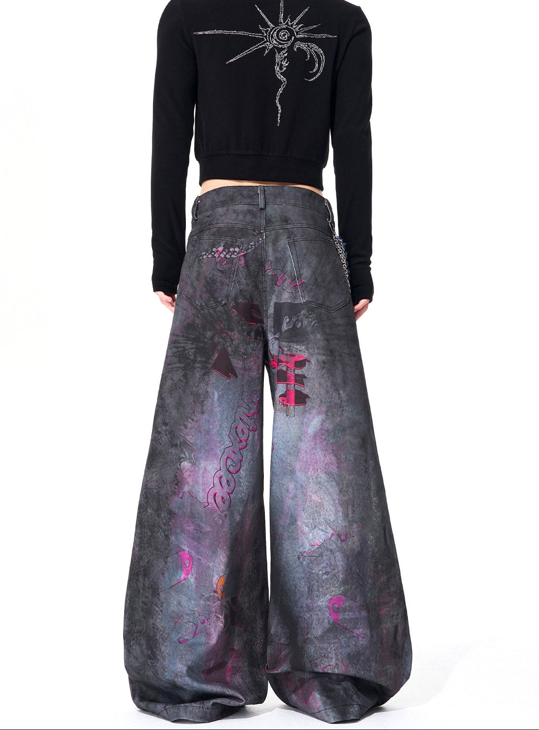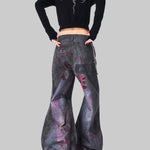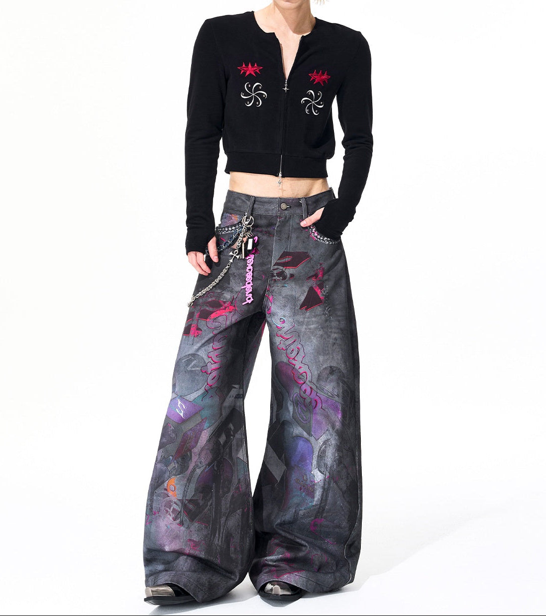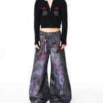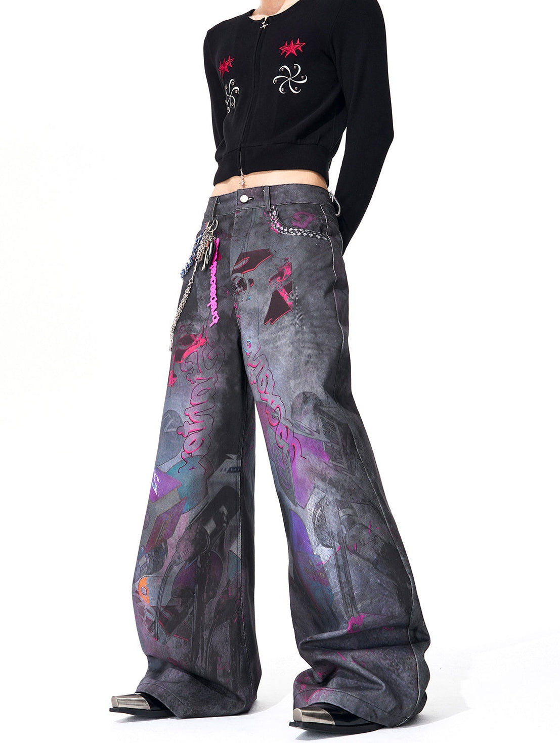 Die Opium Graffiti Art Wide Leg Jeans repräsentiert die Zukunft dystopischer Streetwear durch ihre einzigartige Kombination aus 3D-Digital-Print-Technologie und handwerklicher Verarbeitung. Diese avantgardistische Statement-Hose besteht aus 100% Baumwoll-Denim und besticht durch ihre charakteristische Graffiti-Artwork mit abstrakten Symbolen, Schriftzeichen und Farbverläufen in Pink, Lila und Orange. Die integrierten Kettenelemente mit dekorativem Schlüsselanhänger und die breite Flared-Silhouette schaffen eine perfekte Balance zwischen künstlerischem Ausdruck und rebellischer Mode-Identität.