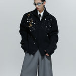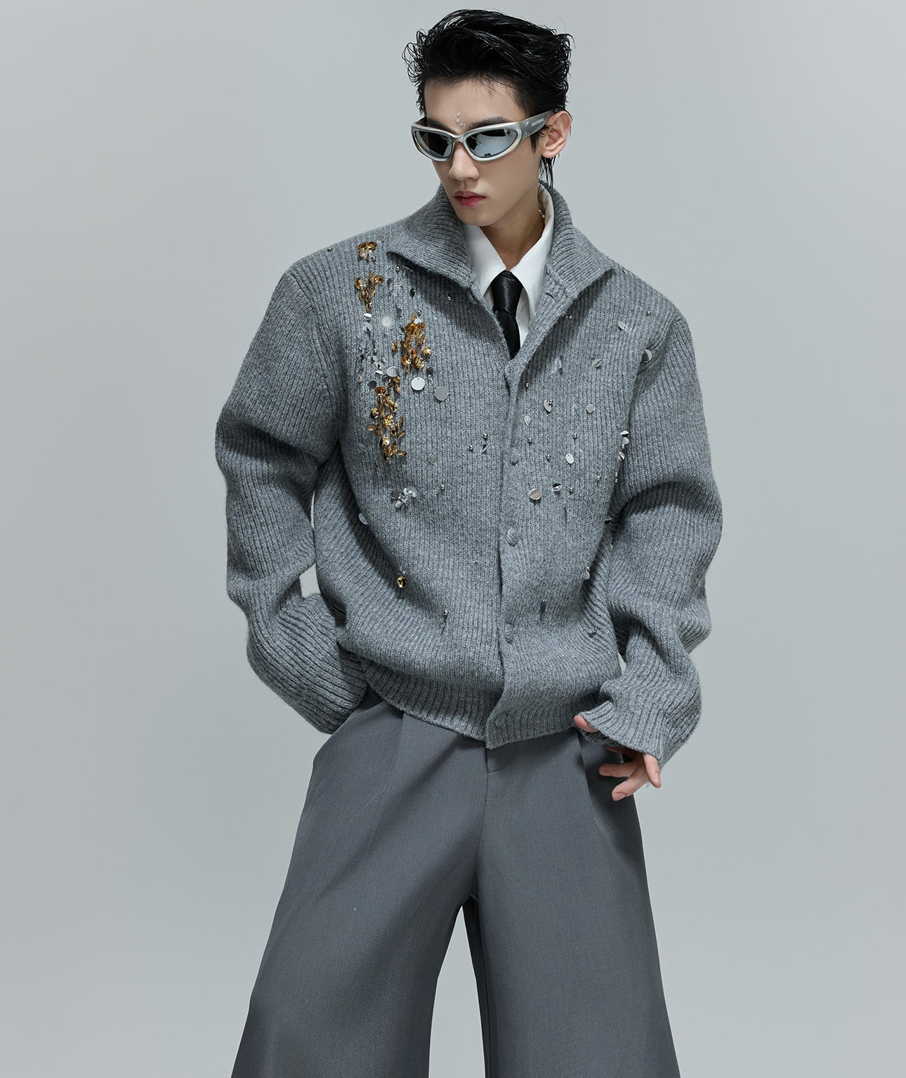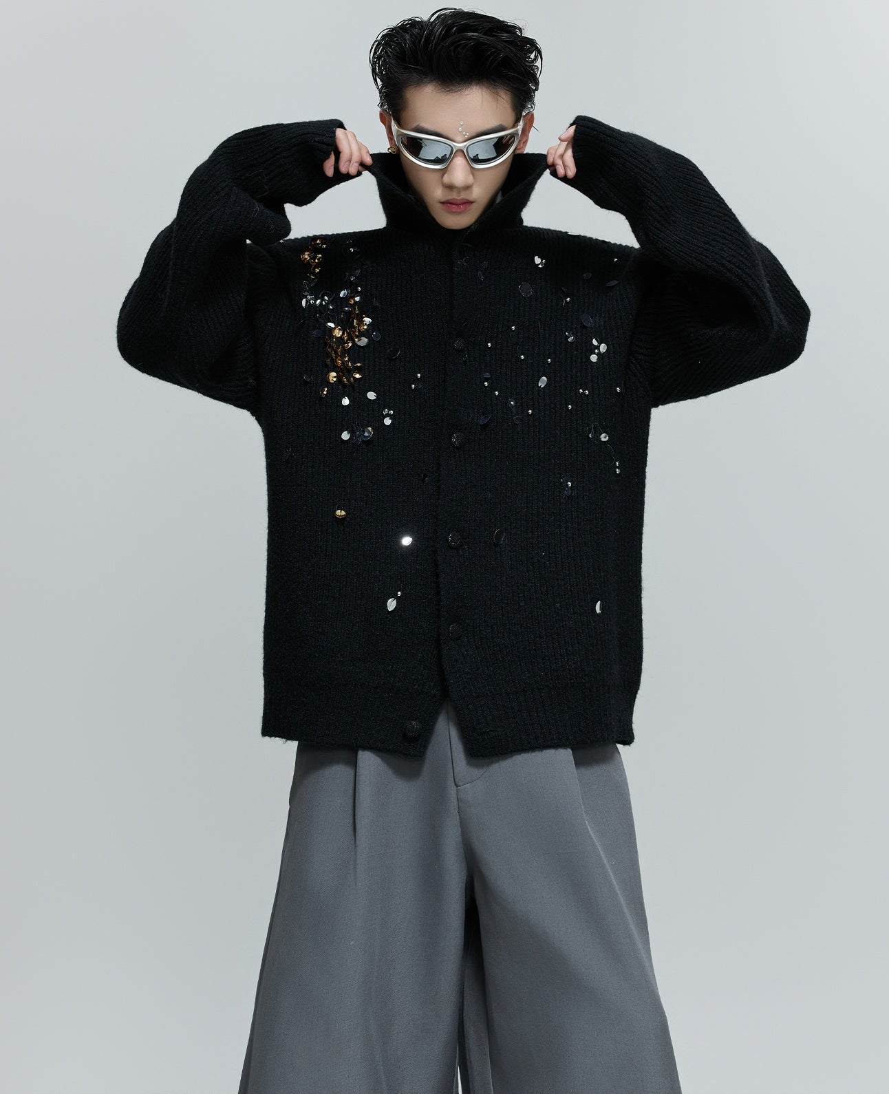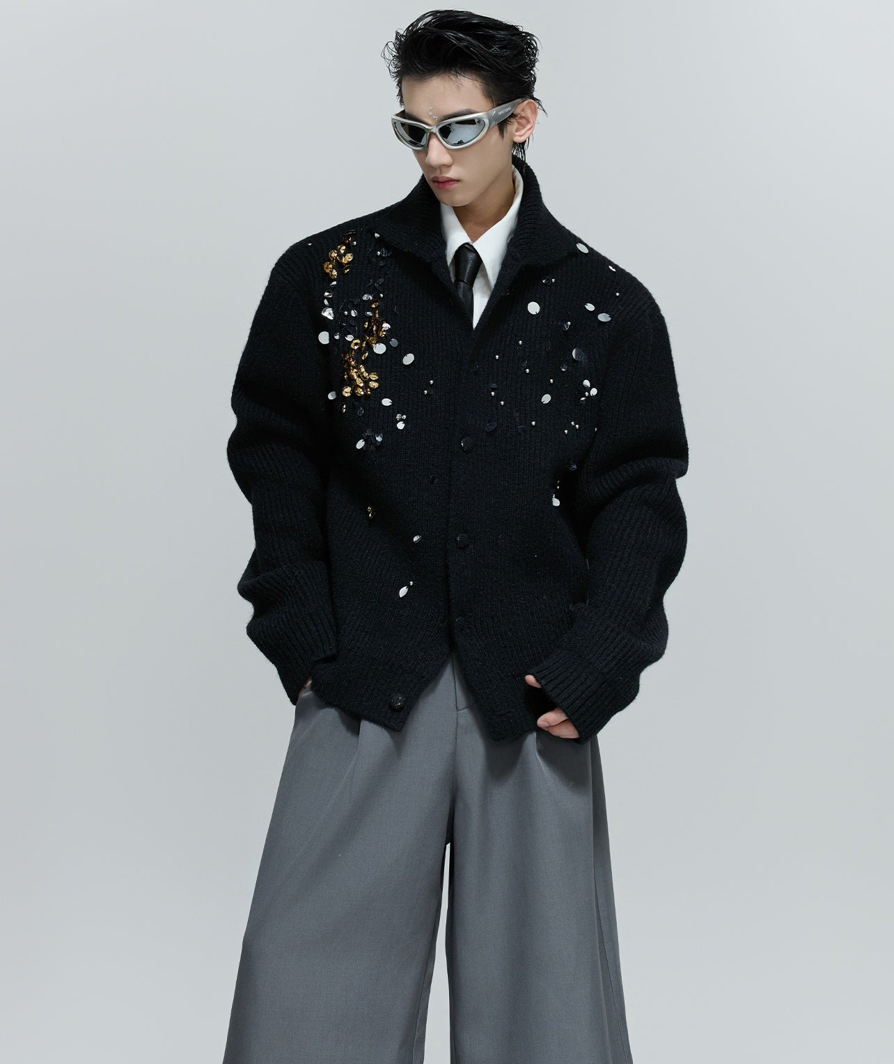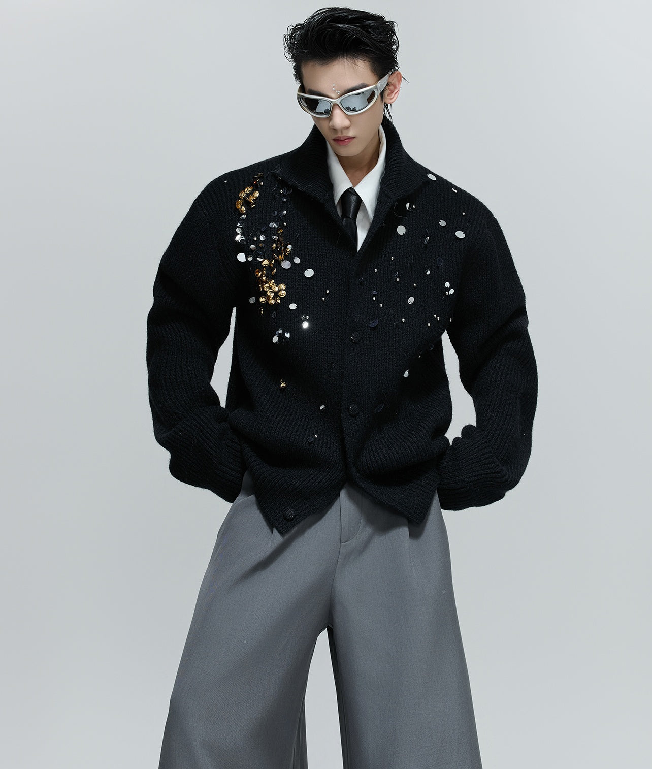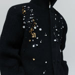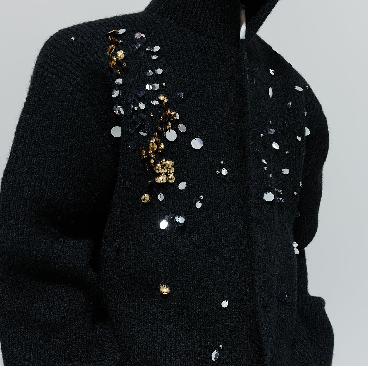 Unser Sequin Embellished Cardigan definiert luxuriöse Opium Fashion durch sein handverarbeitetes Pailletten-Design neu. Die asymmetrisch platzierten Pailletten in Gold, Silber und Schwarz formen ein organisches, fast kosmisches Muster auf der Schulterpartie und Brust. Die Premium-Strickkonstruktion aus 55% Baumwolle und 45% Wolle bietet optimale Wärme und Tragekomfort. Der verkürzte Schnitt mit breitem Reverskragen und oversized Passform ermöglicht vielseitige Layering-Optionen. Entdecke unsere komplette Opium Fashion Kollektion für weitere luxuriöse Knitwear Pieces.