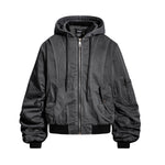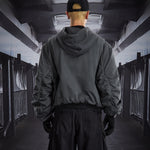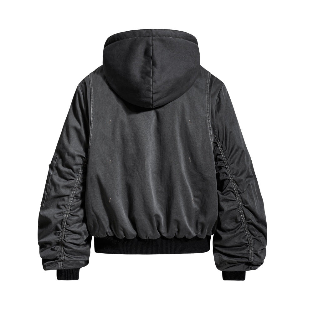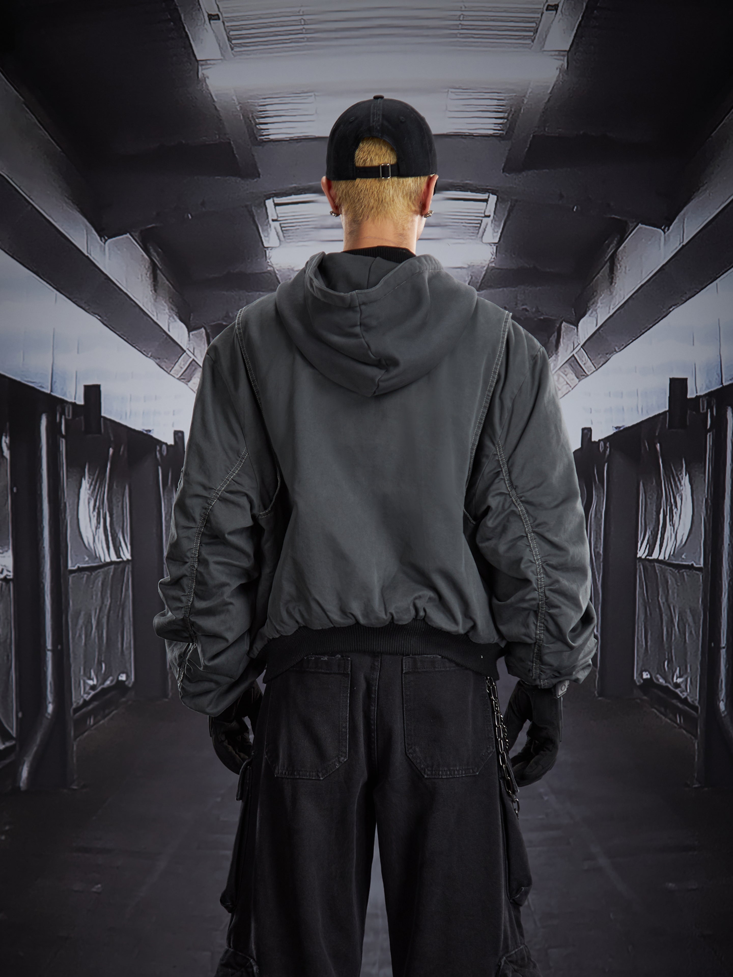 Die Techwear Hooded Bomber Jacket vereint klassische Bomber-Silhouette mit zeitgenössischer Techwear-Funktionalität durch ihre innovative Multi-Material-Konstruktion und technische Details. Diese Premium-Jacke besteht aus 100% Baumwolle und besticht durch ihr einzigartiges Two-Tone-Design mit washed Denim-Body und kontrastierenden schwarzen Ärmeln. Die oversized Silhouette mit integrierter Kapuze, funktionalen Utility-Taschen und gerippten Bündchen schafft die perfekte Balance zwischen urbaner Streetwear-Ästhetik und technischer Innovation – ideal für das moderne Techwear-Statement.