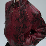 Nosso Bomber Snakeskin Studded define Opium Novidade na moda graças à sua textura exclusiva com estampa de cobra em couro sintético de alta qualidade. Os impressionantes detalhes dos rebites vermelhos formam padrões geométricos ao longo da área dos ombros e criam um contraste fascinante com a estrutura da superfície semelhante a um réptil. O corte bomber curto com punhos elásticos e zíper completo permite opções de estilo versáteis. O luxuoso forro interior em vermelho contrastante (para a versão preta) sublinha a qualidade premium. Conheça nosso completo Opium Coleção de moda para peças estéticas escuras mais luxuosas.